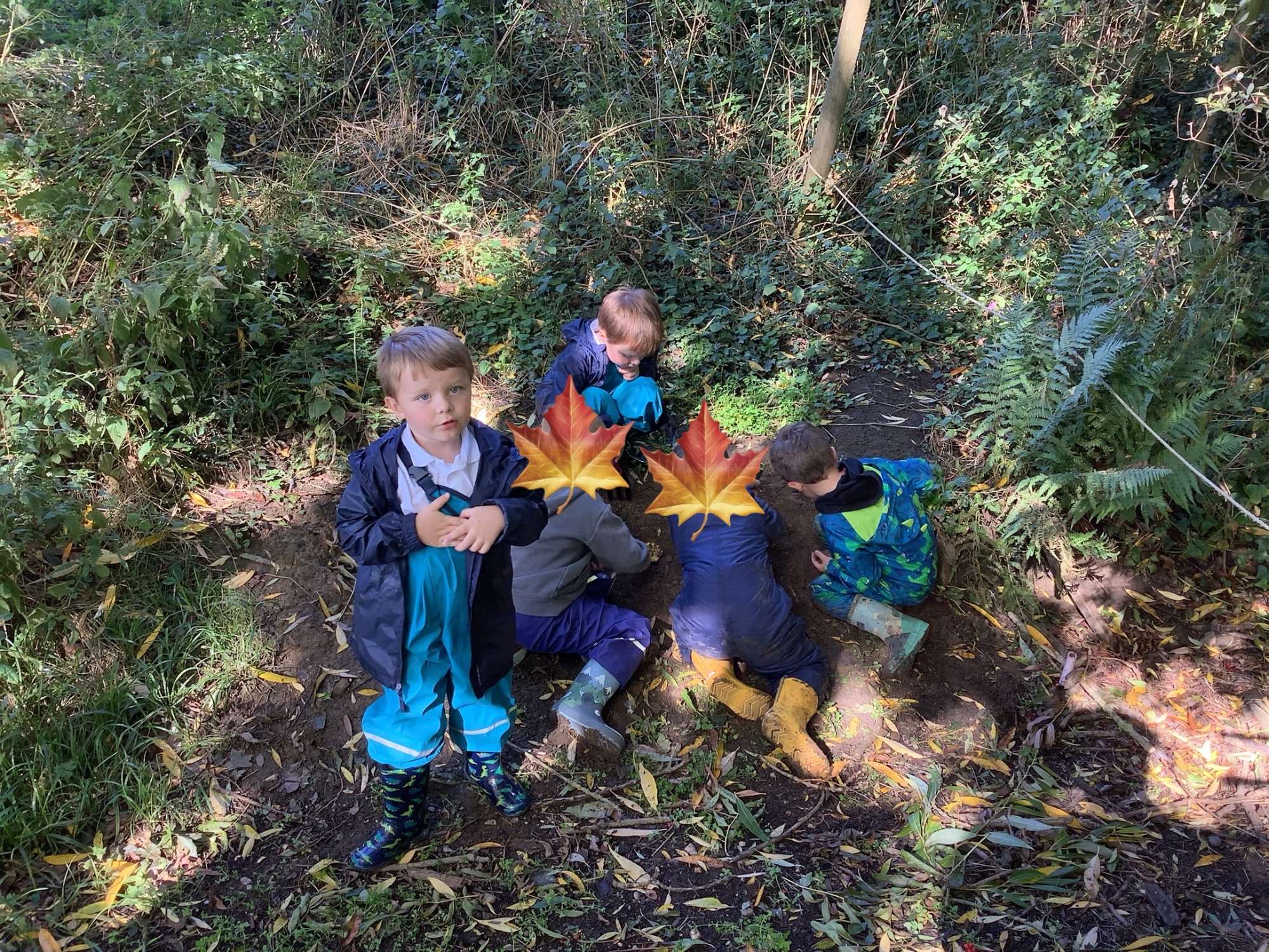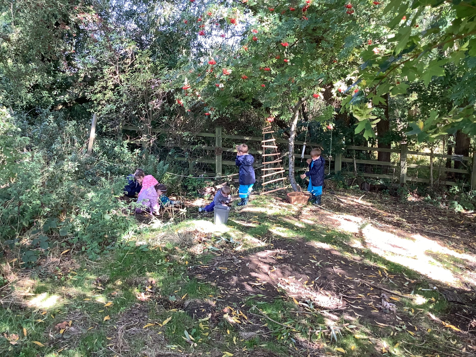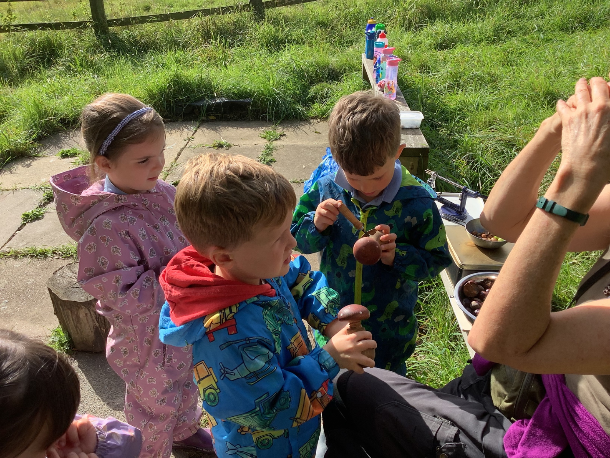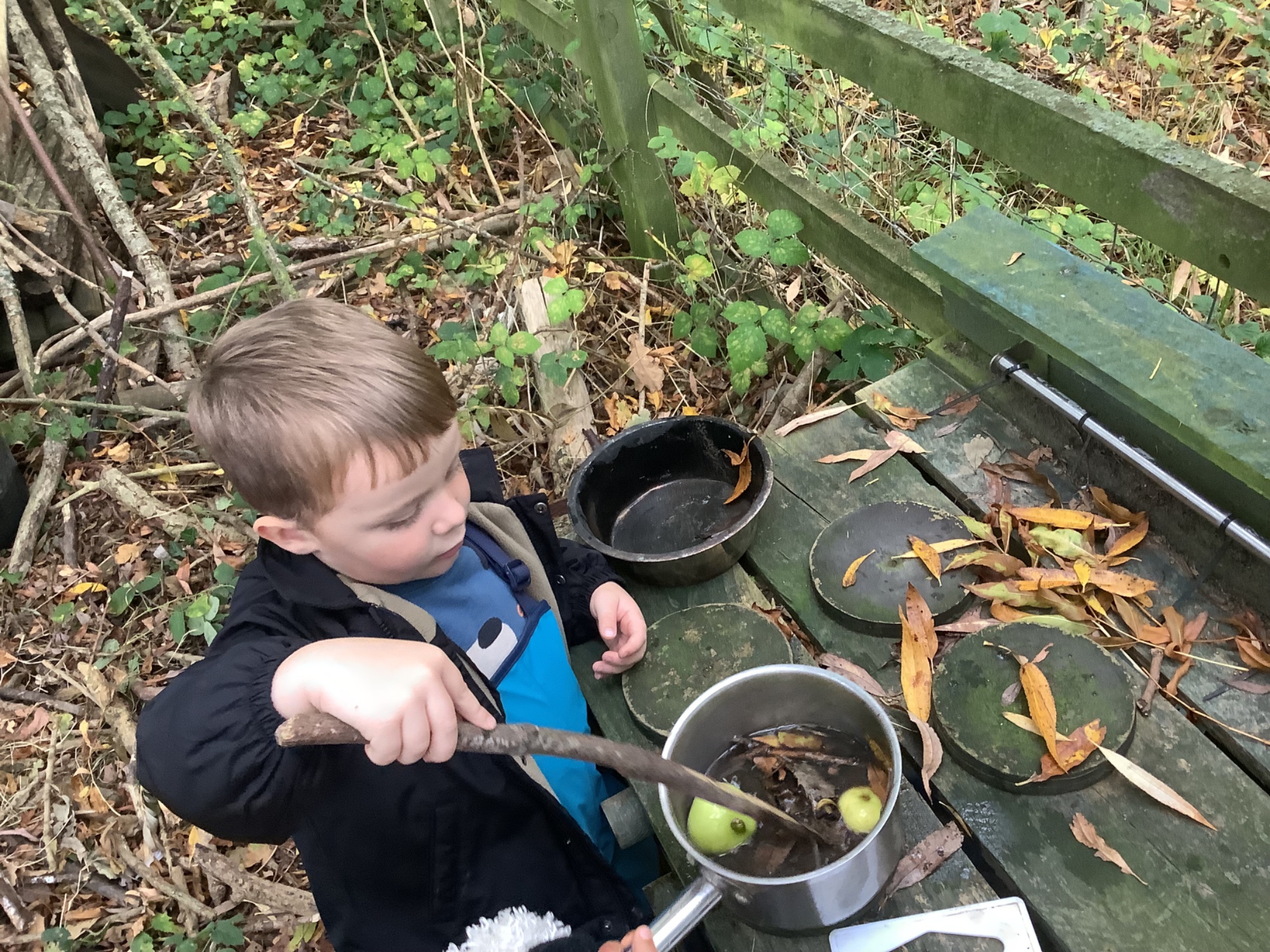 We have had a great afternoon exploring outside. We have peeled apples, made conker necklaces, played with instruments and hand puppets. We have made some potions in the mud kitchen too.