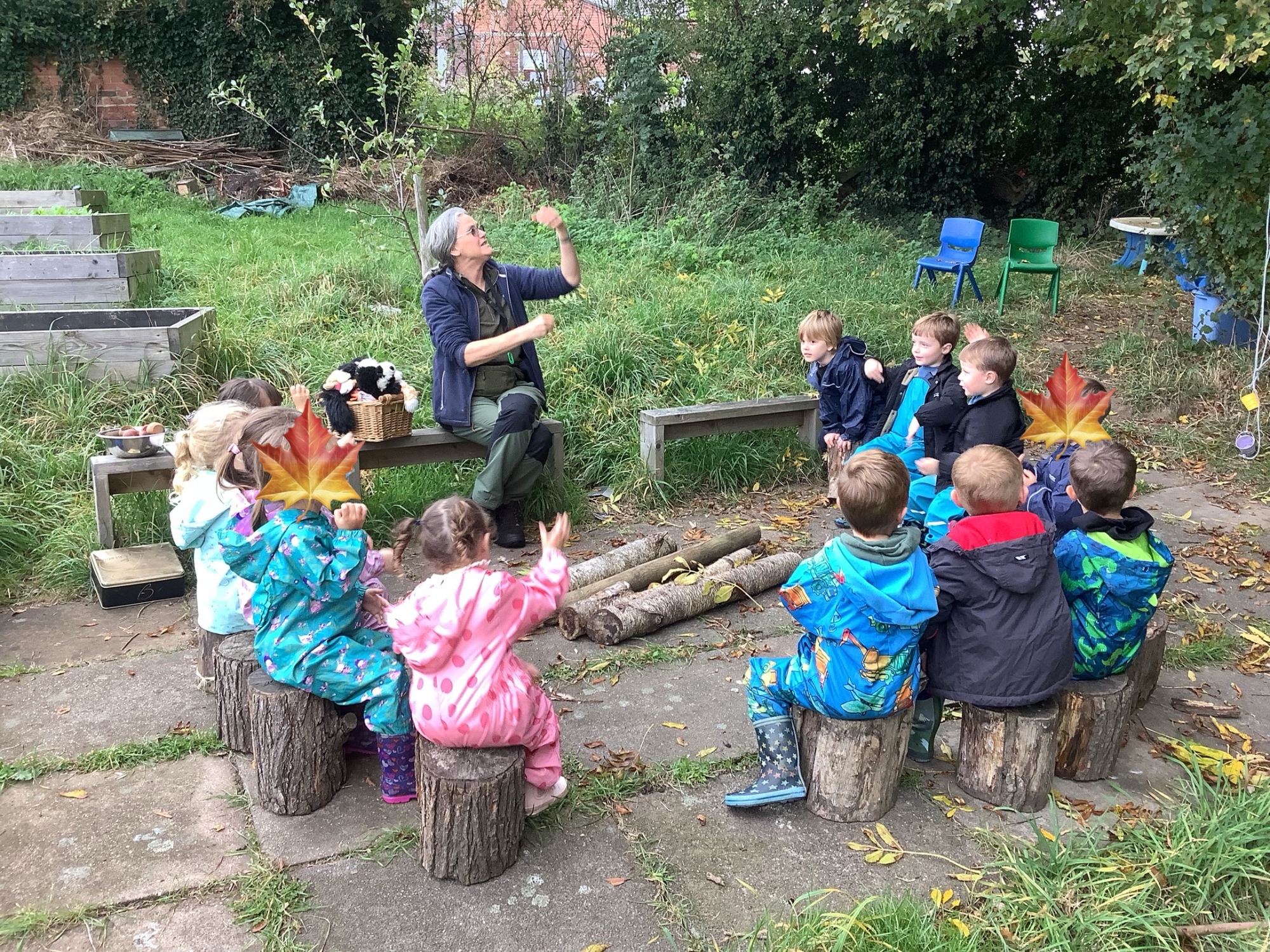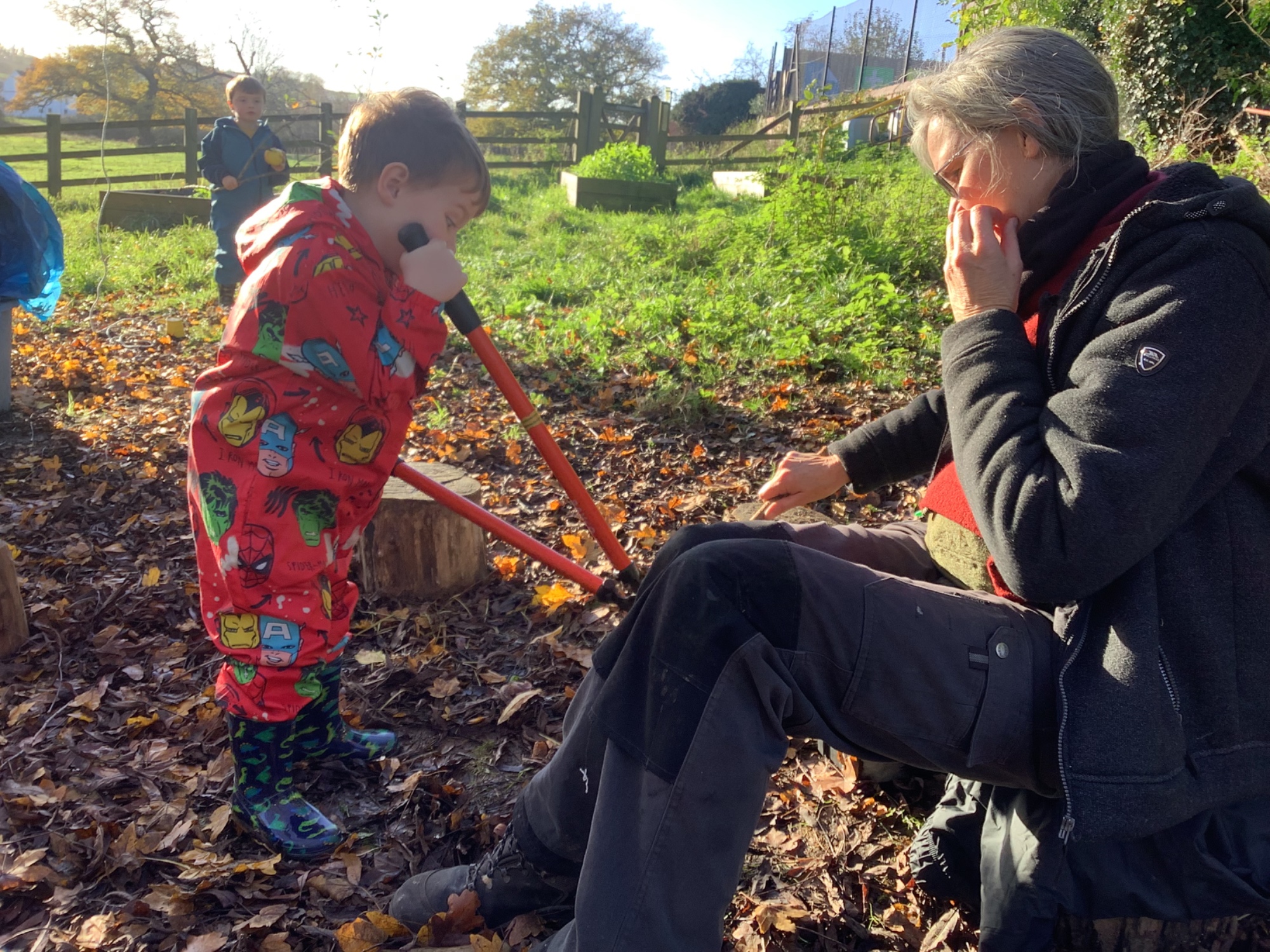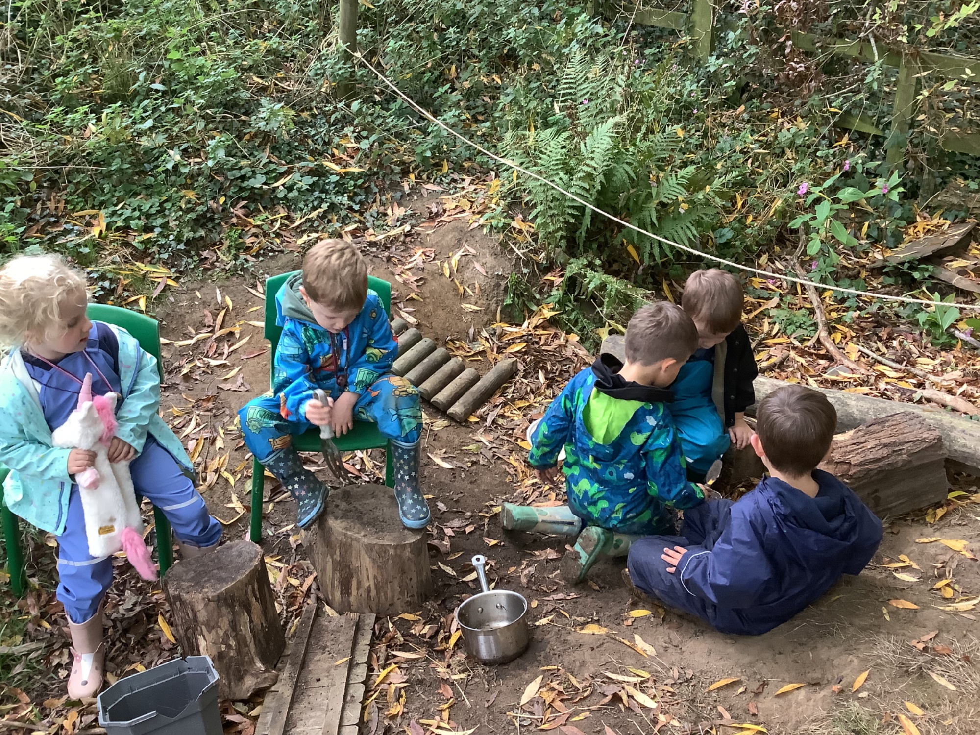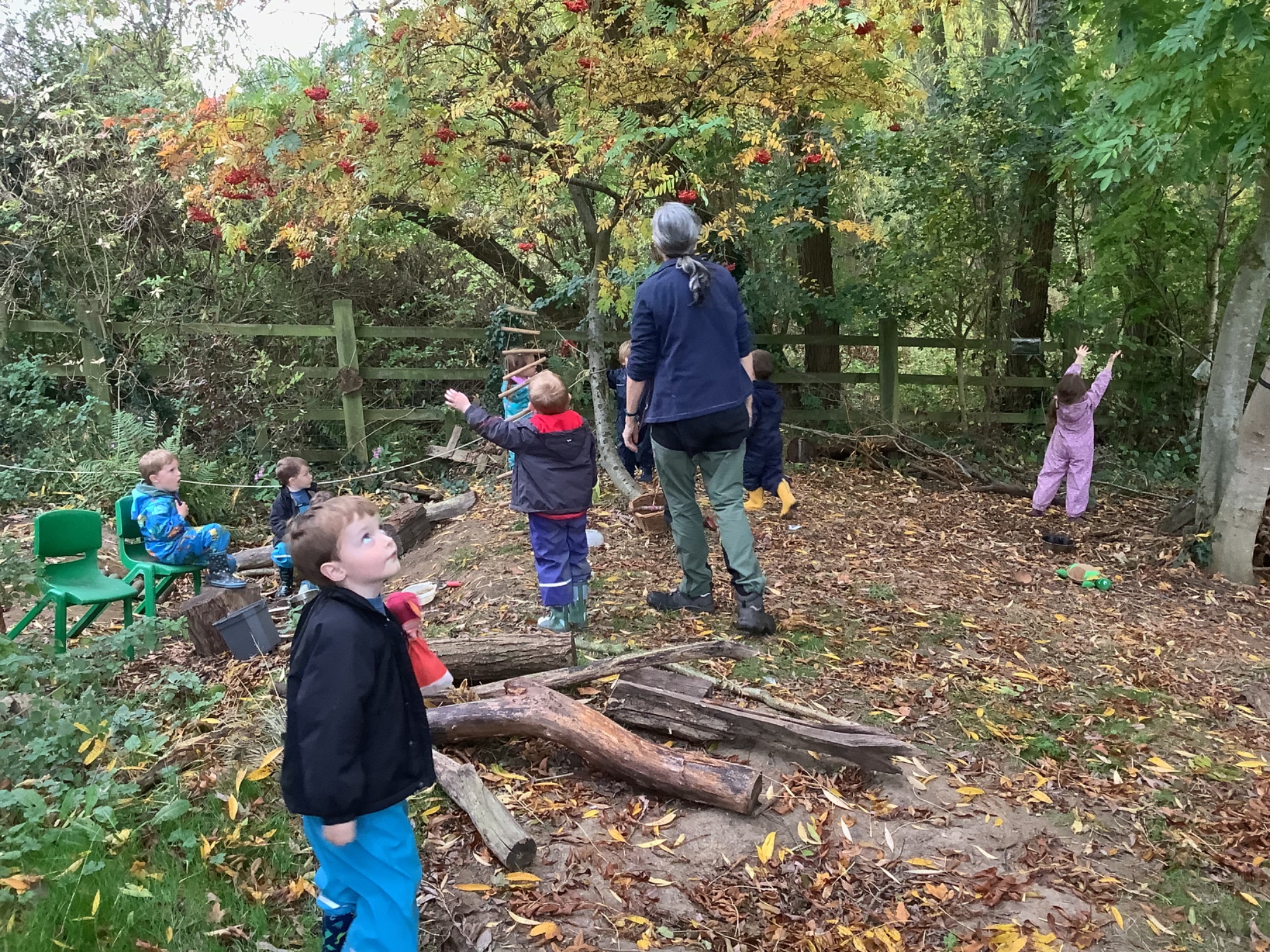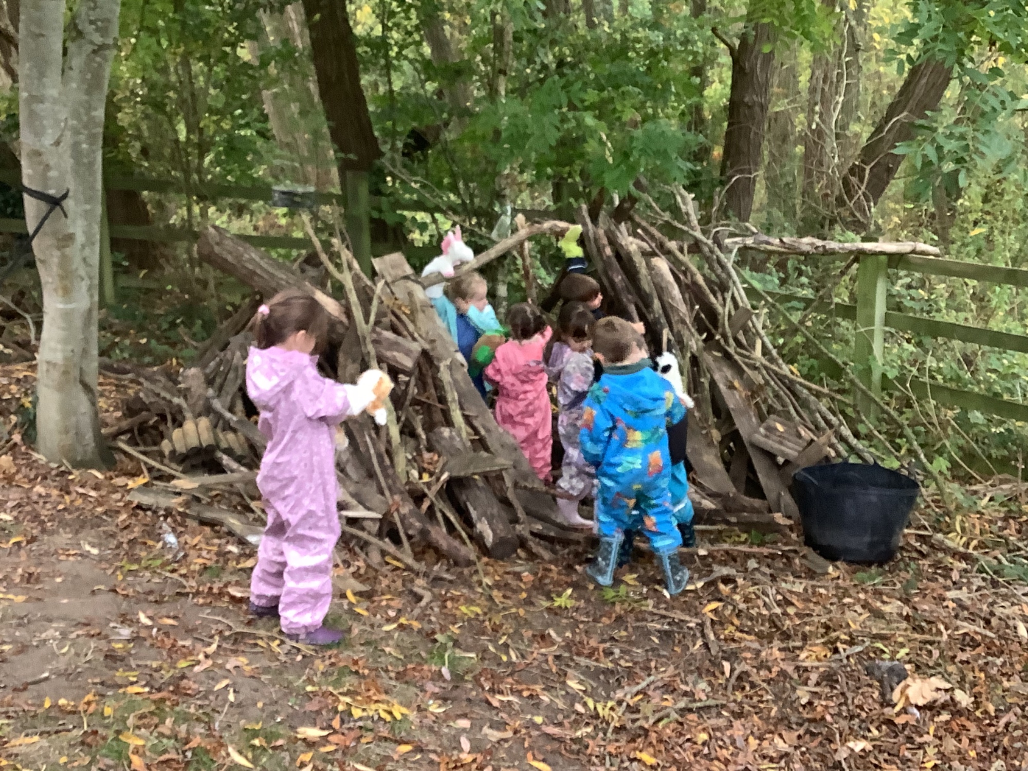 We have had a great afternoon exploring outside. We have peeled apples, made conker necklaces, played with instruments and hand puppets. We have made some potions in the mud kitchen too.
