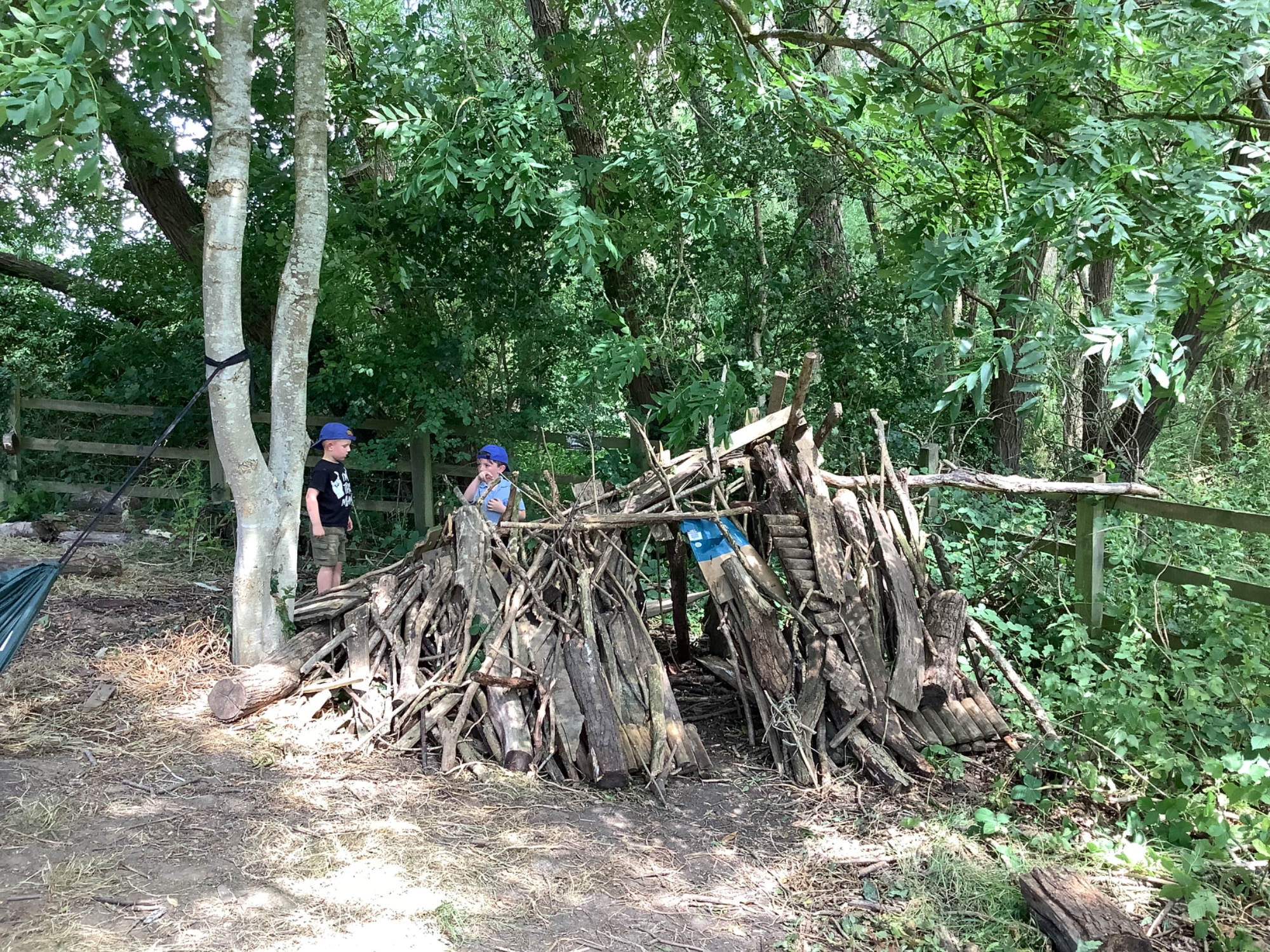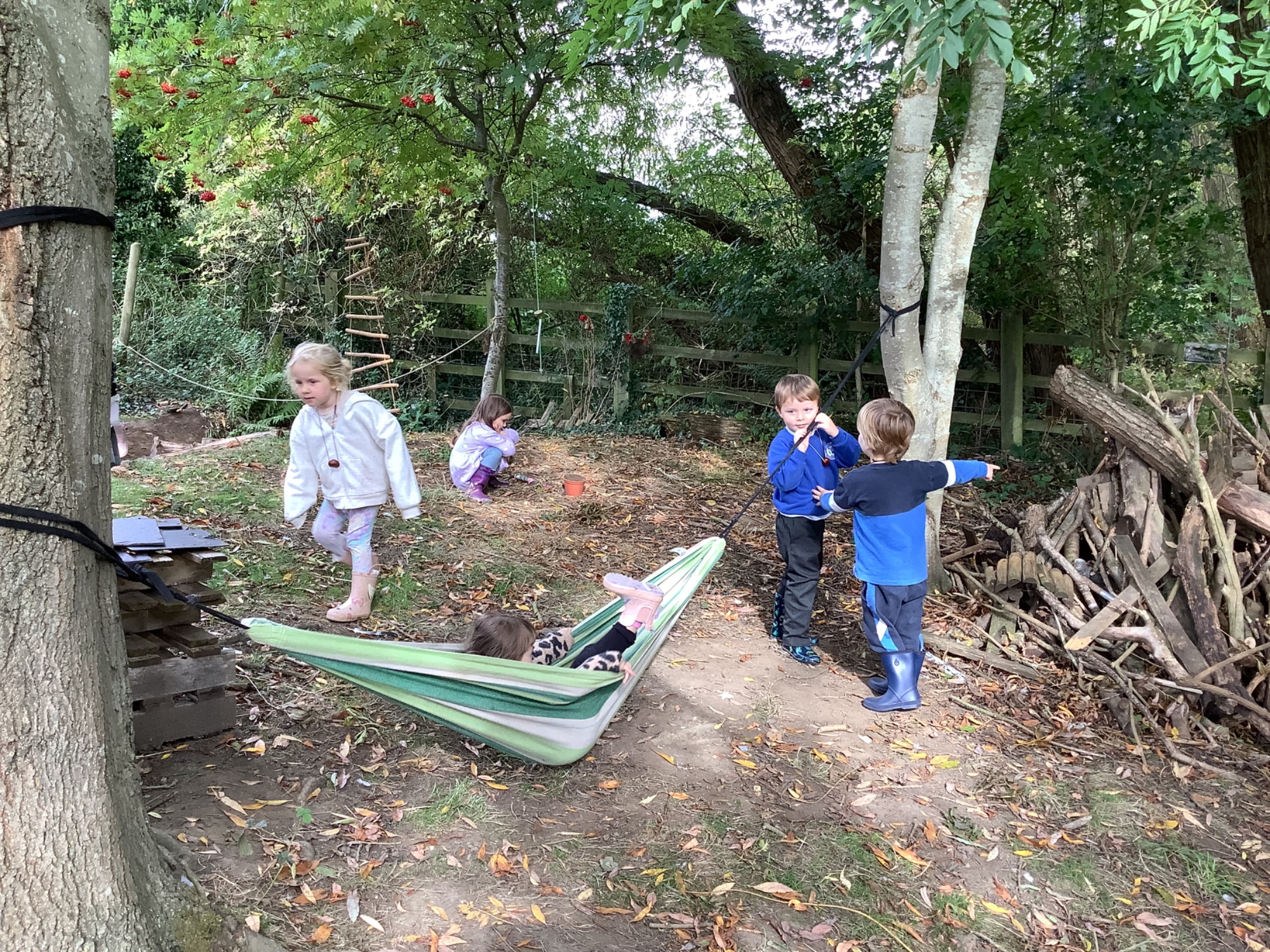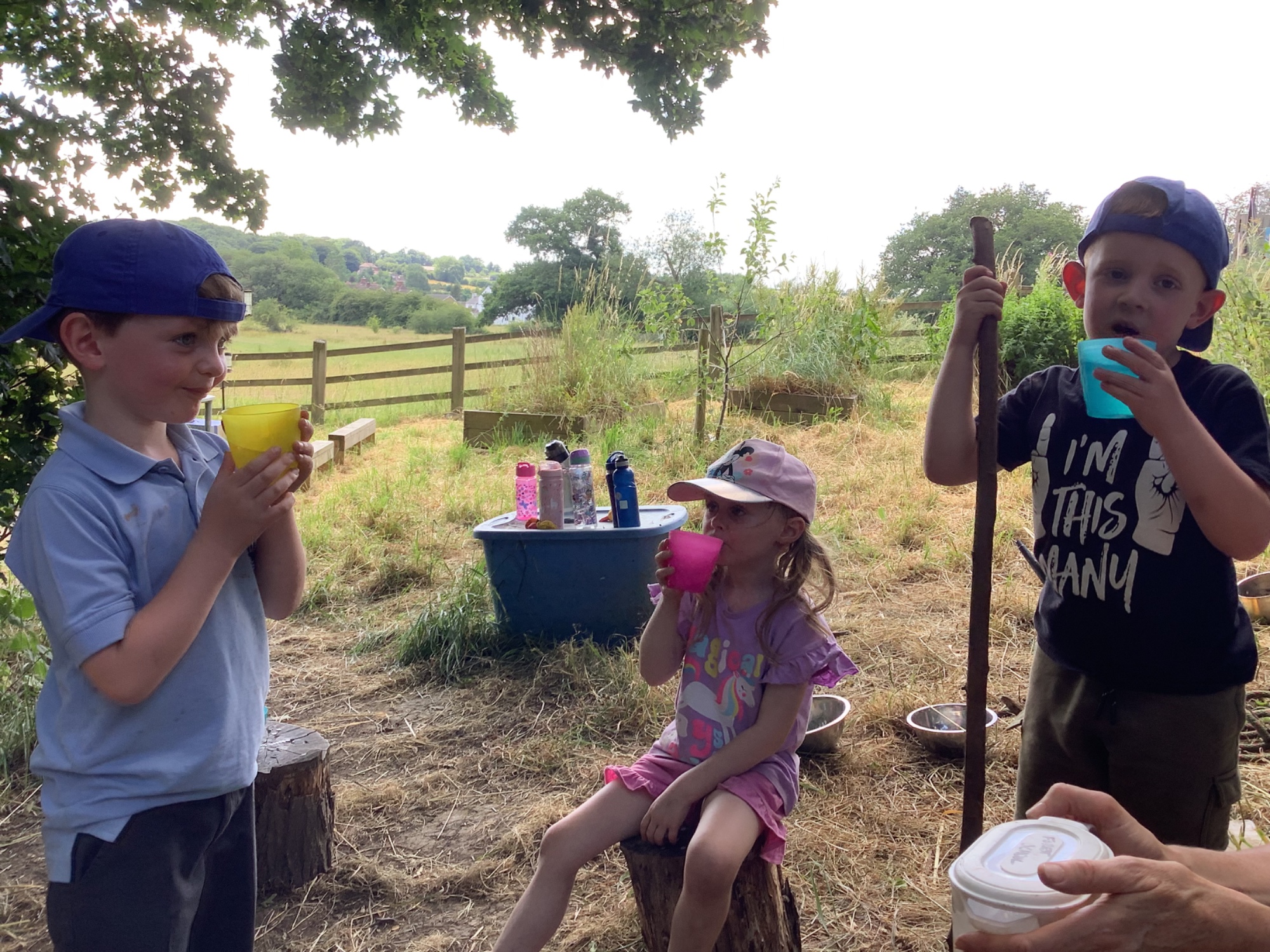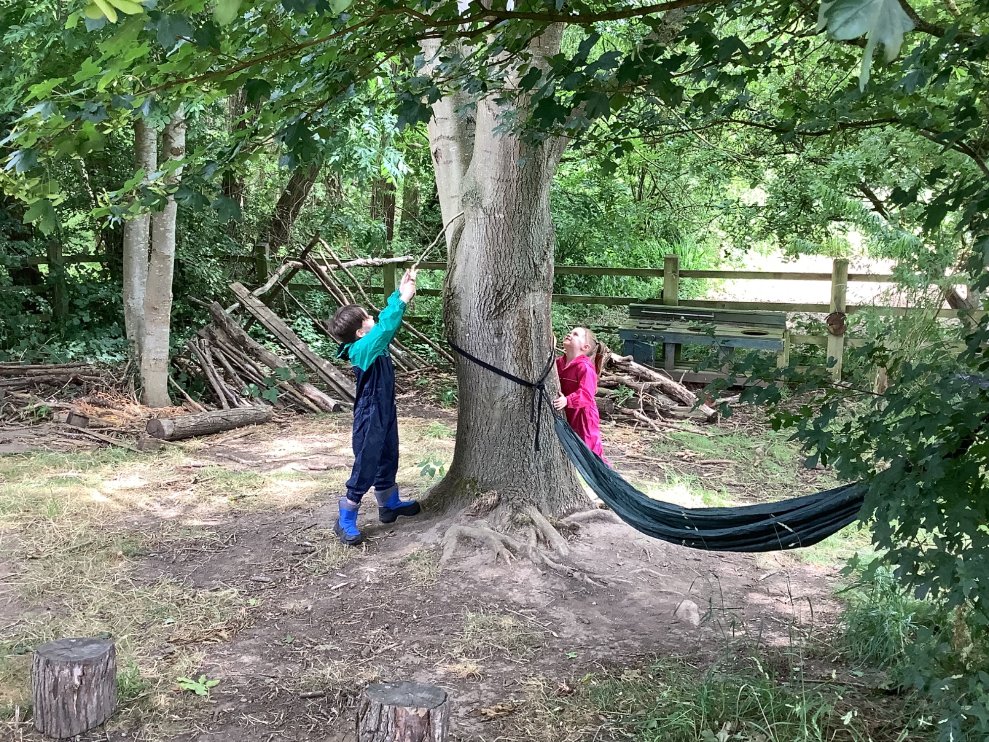 Today it was very warm, but we kept cool in forest school by keeping in the shade and having iced water to drink and Elderberry cordial. We swung in the hammocks and played in the den all while under cover of the beautiful trees.