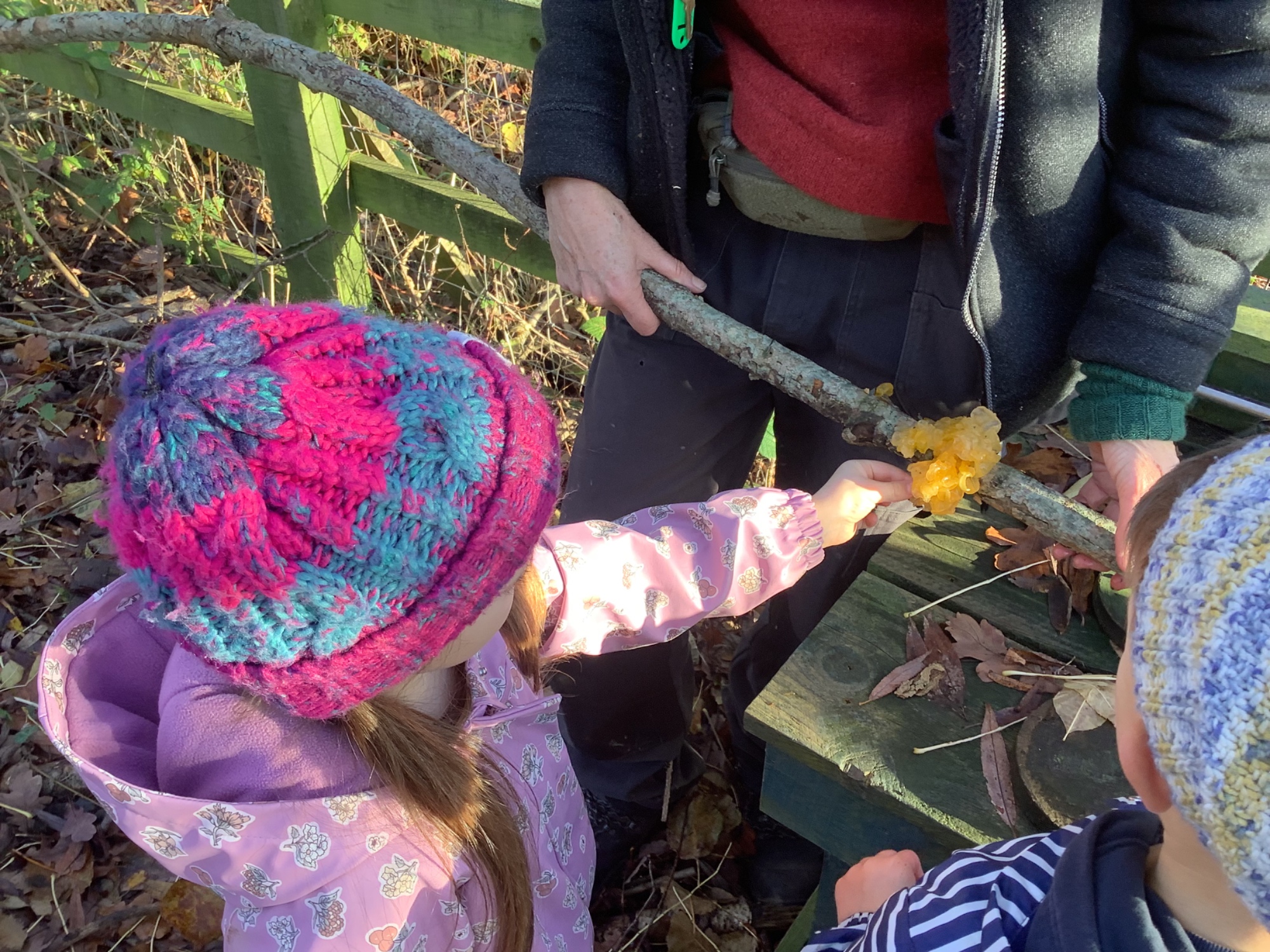 We looked at the leaves around us and cut sticks to decorate. We then found something on a branch and Lauren told us that it was a jelly fungus and that it was safe to touch. It felt just like wobbly jelly!