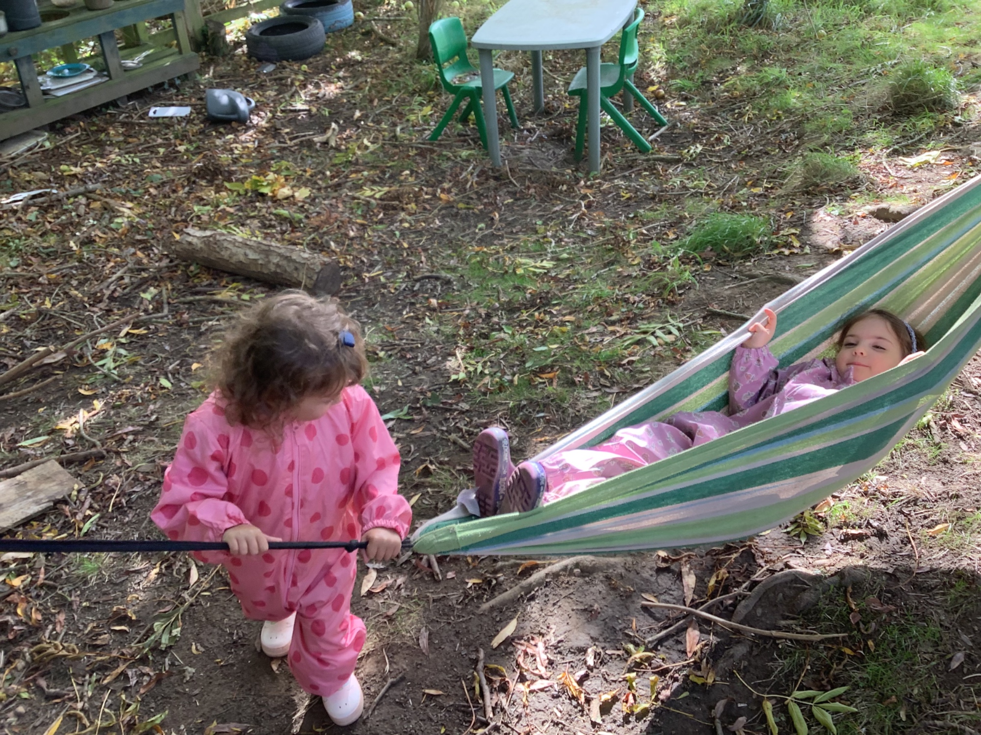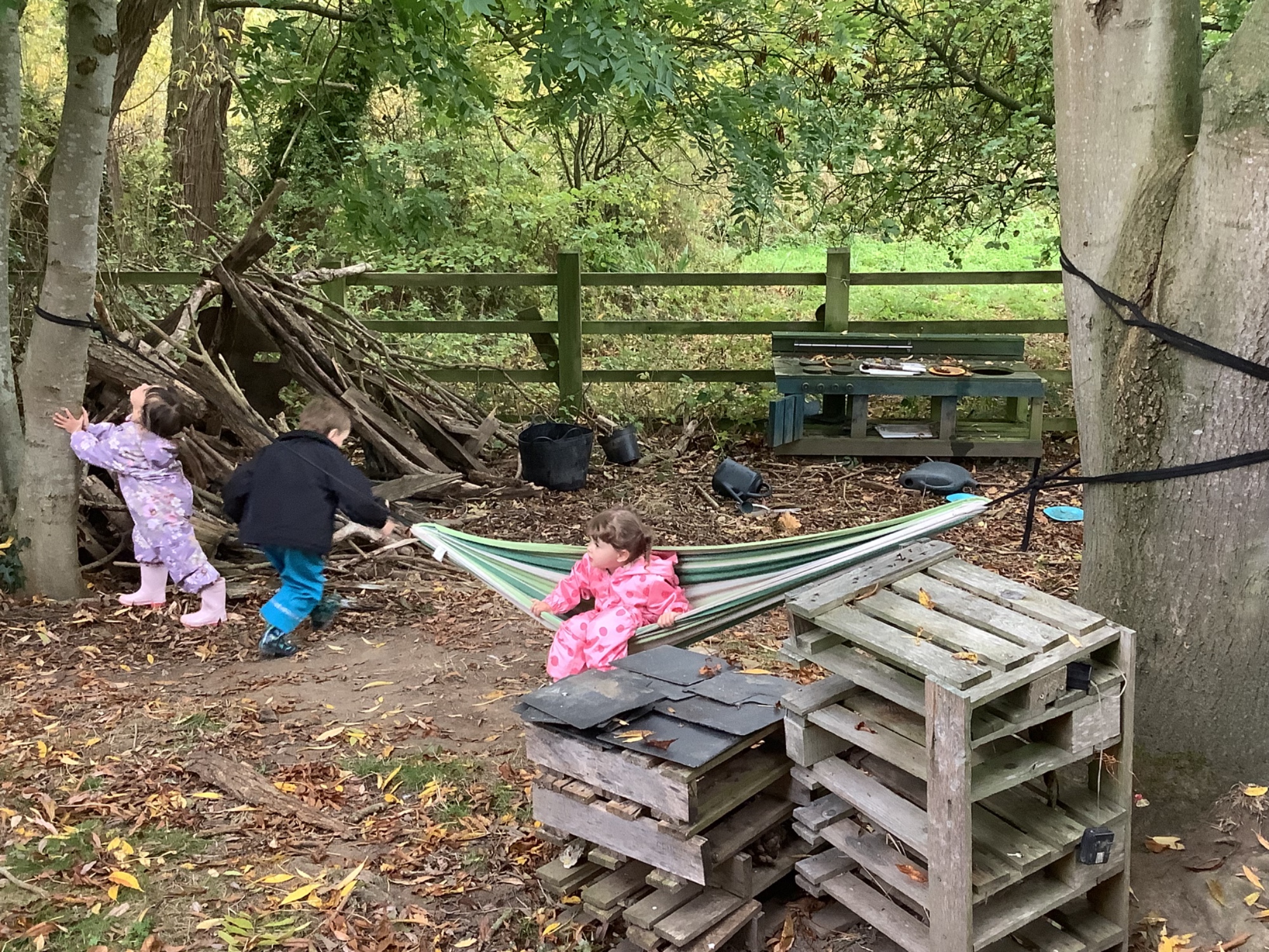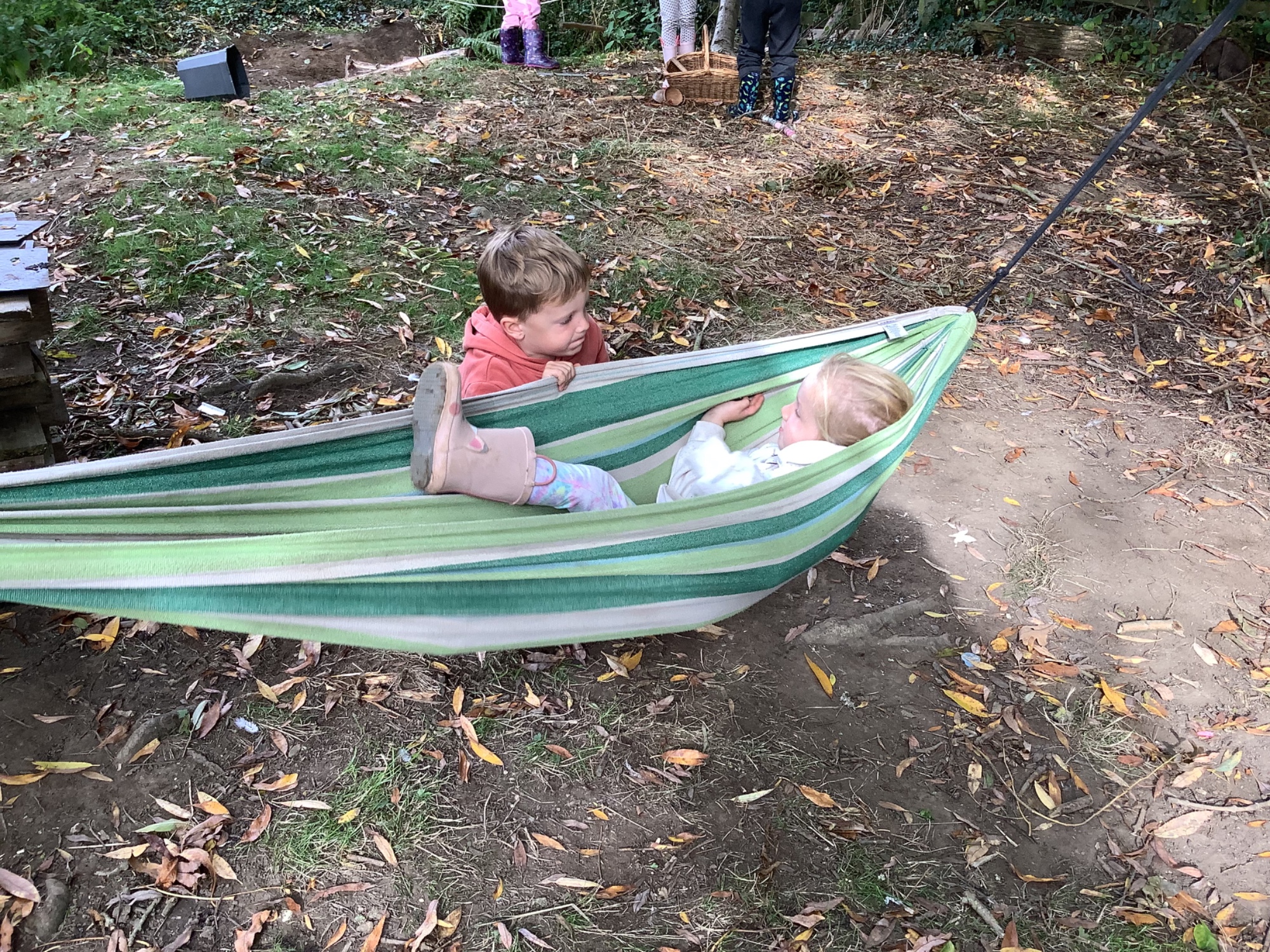 The children had a great session today. They enjoyed eating their crunchy apples which they peeled and spiralled with Lauren. Some children relaxed in the hammocks and others were building dens.