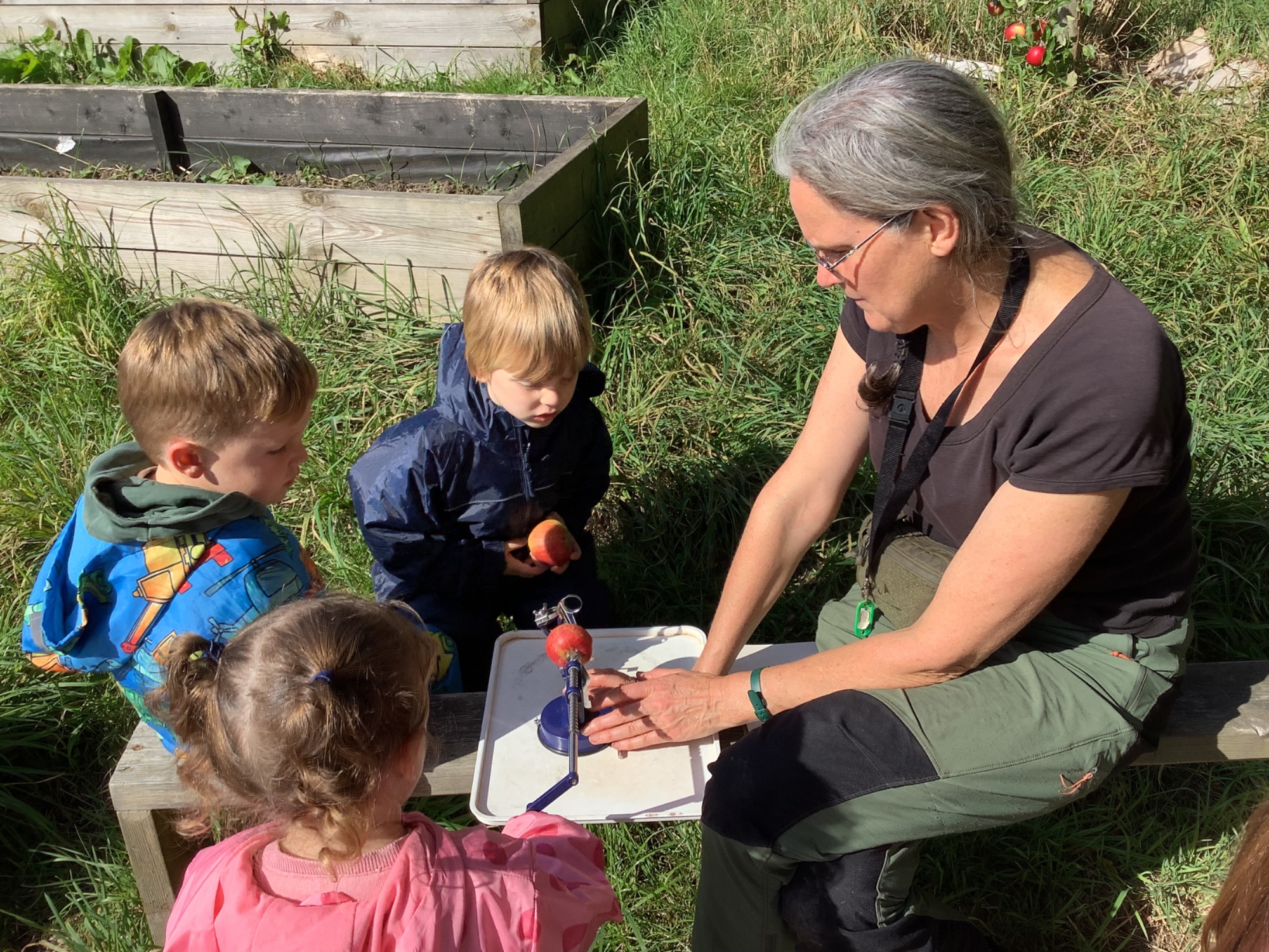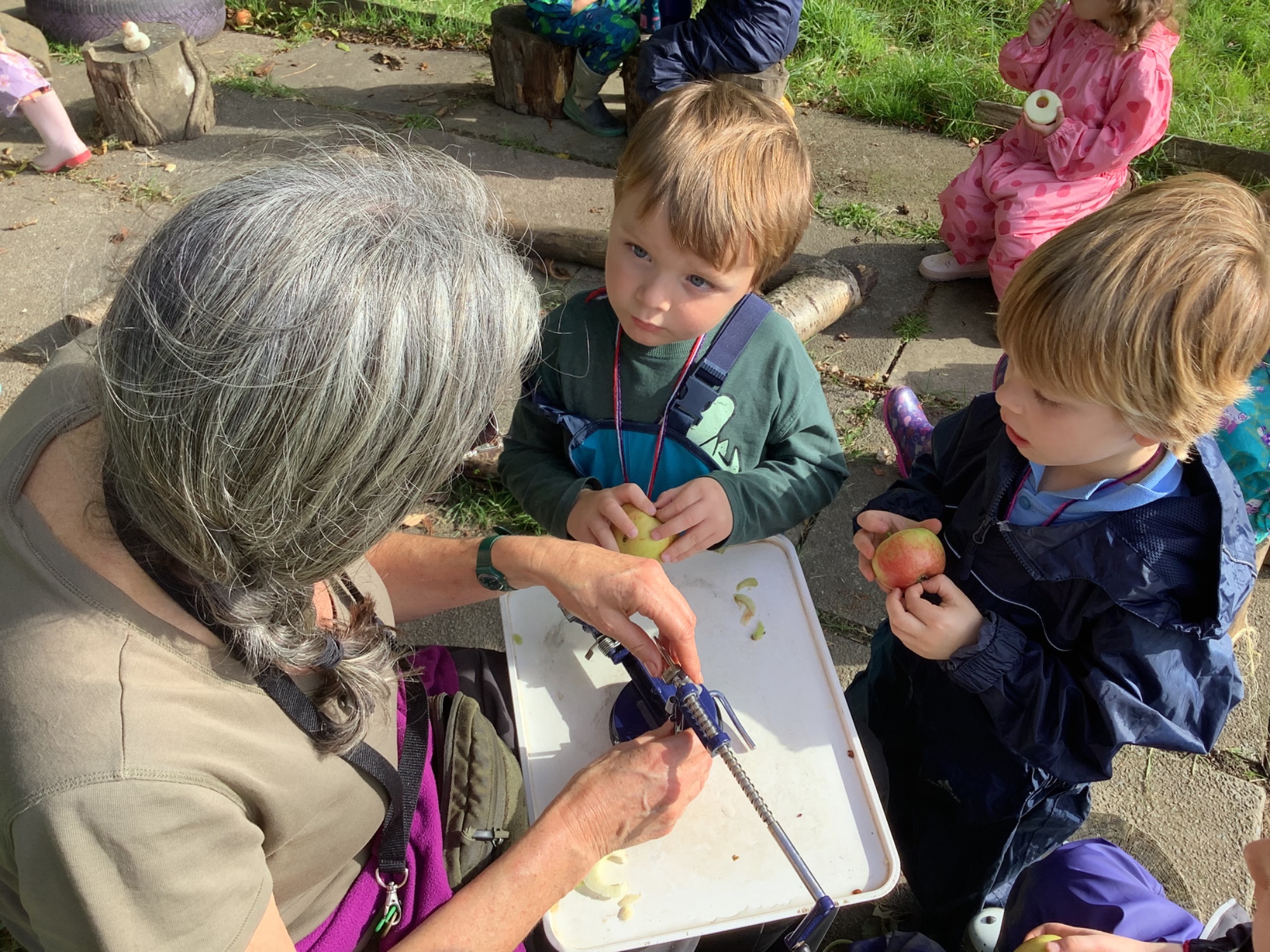 Today we got to identify different types of slugs using Lauren's identifying cards, not only did we find slugs but we also found worms and beetles and used magnifying glasses to look at them closely. Lauren kindly bought in some apples for us, we used her spiral machine which peeled and took the core out, we loved our tasty treat.