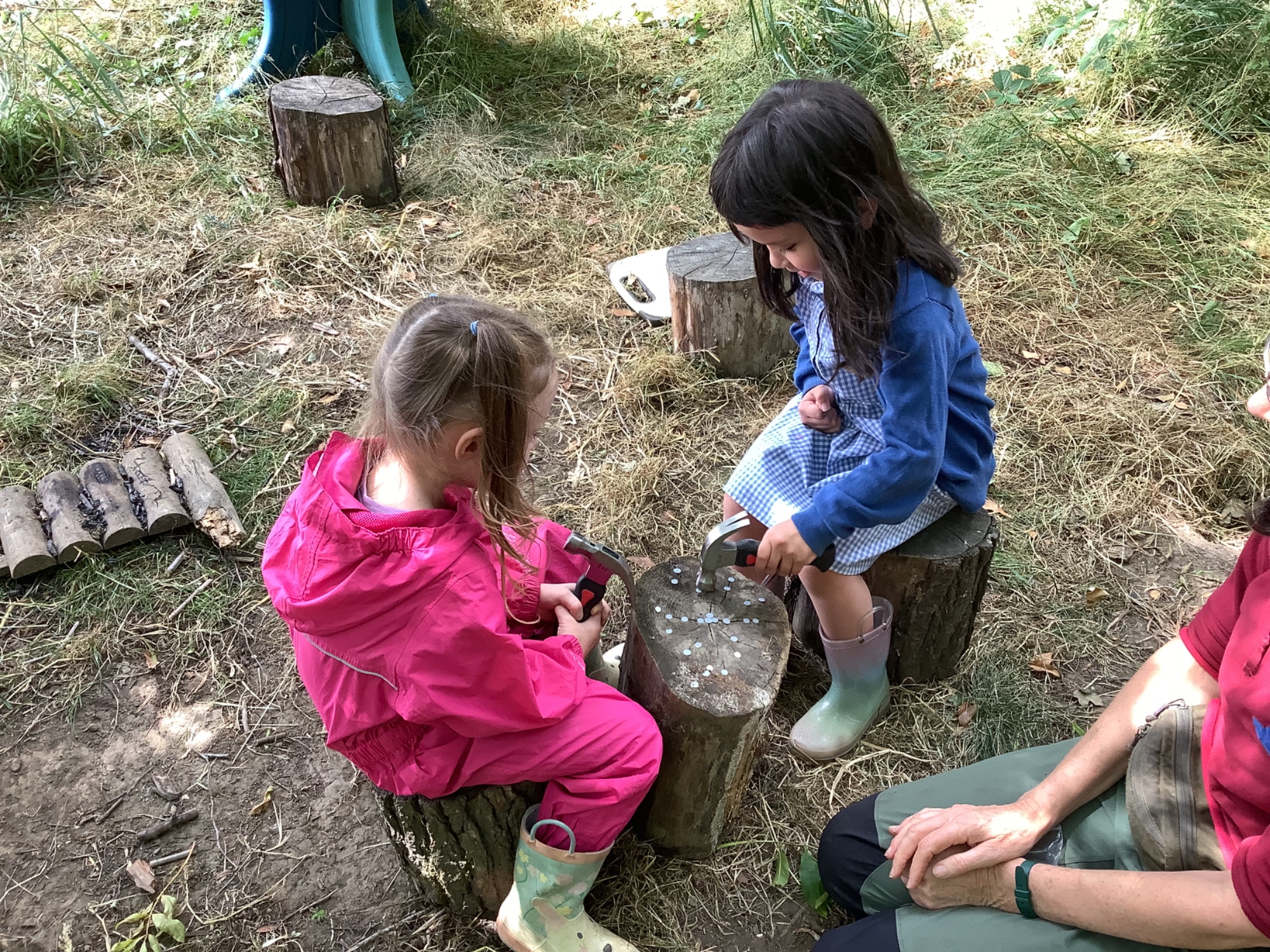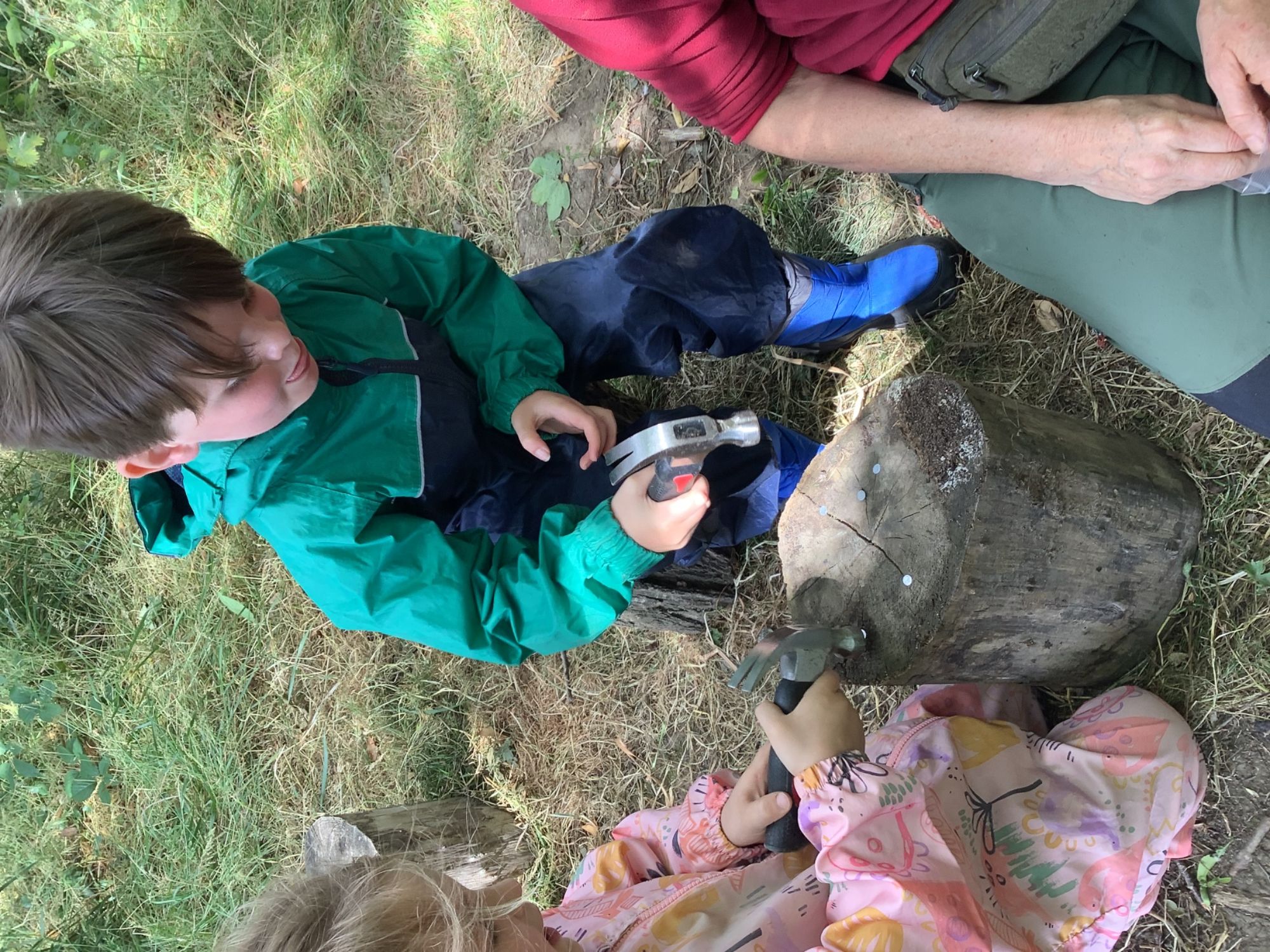 Today at forest school we have been learning how to use tools safely. We have used the hammer to knock nails into a log.