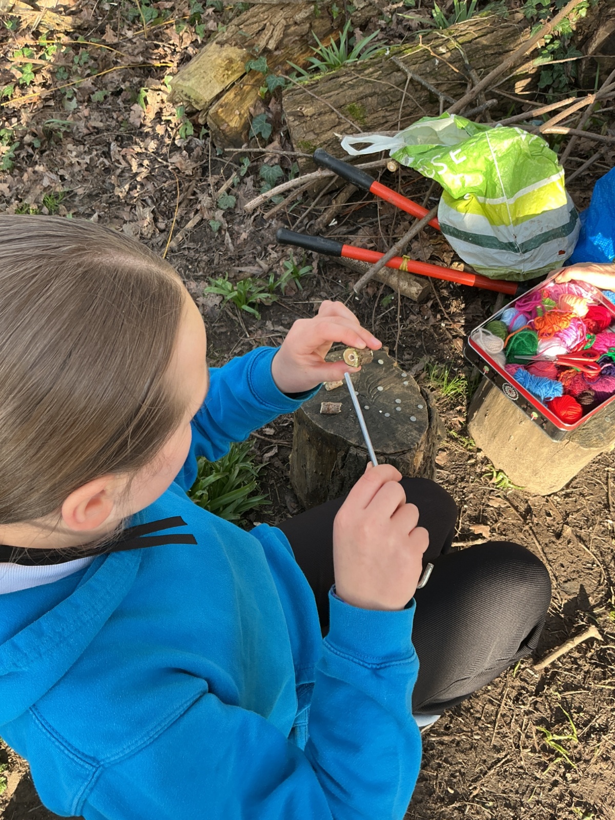 Today at forest school we have been learning how to use tools safely. We have used the hammer to knock nails into a log.