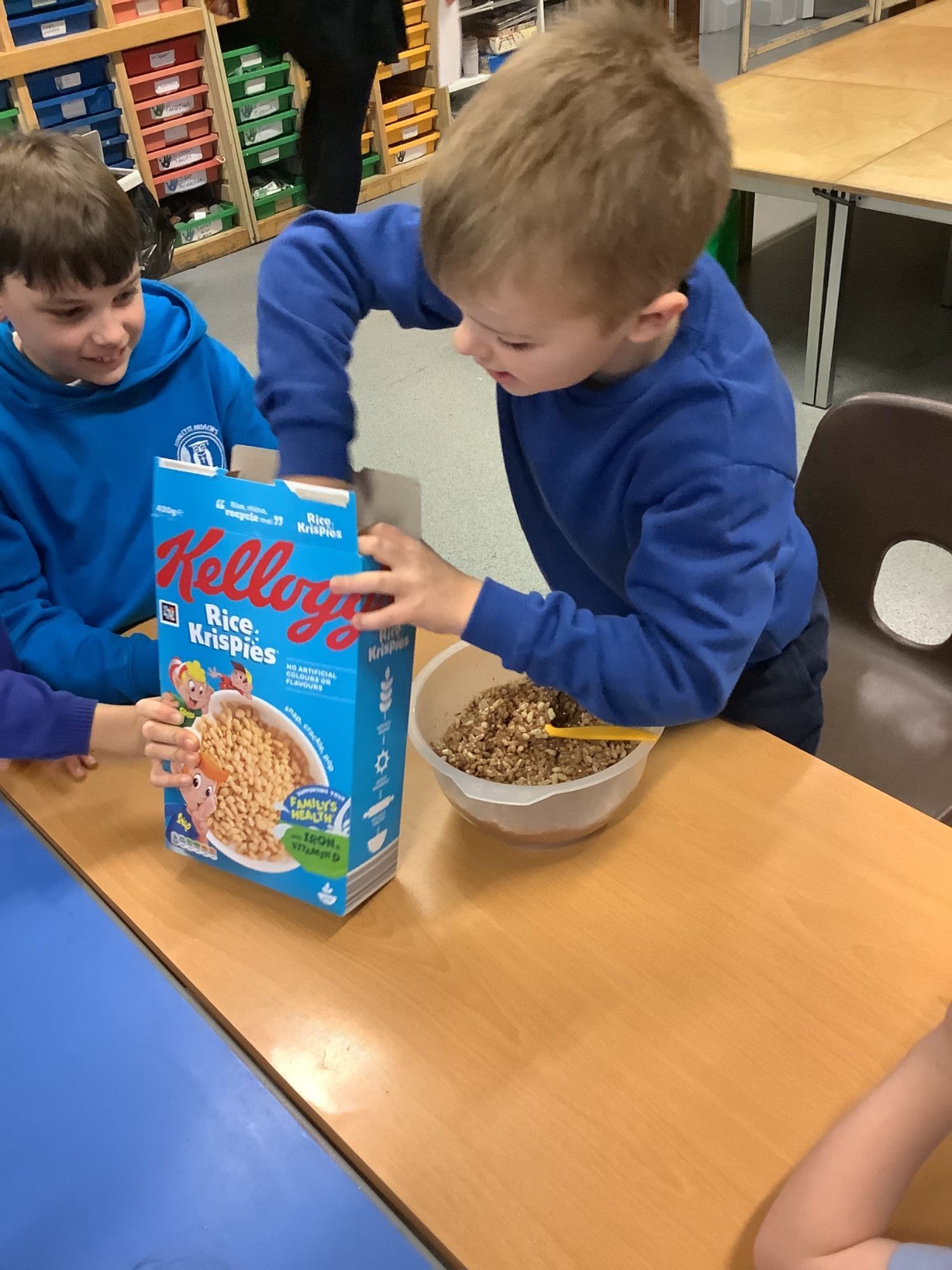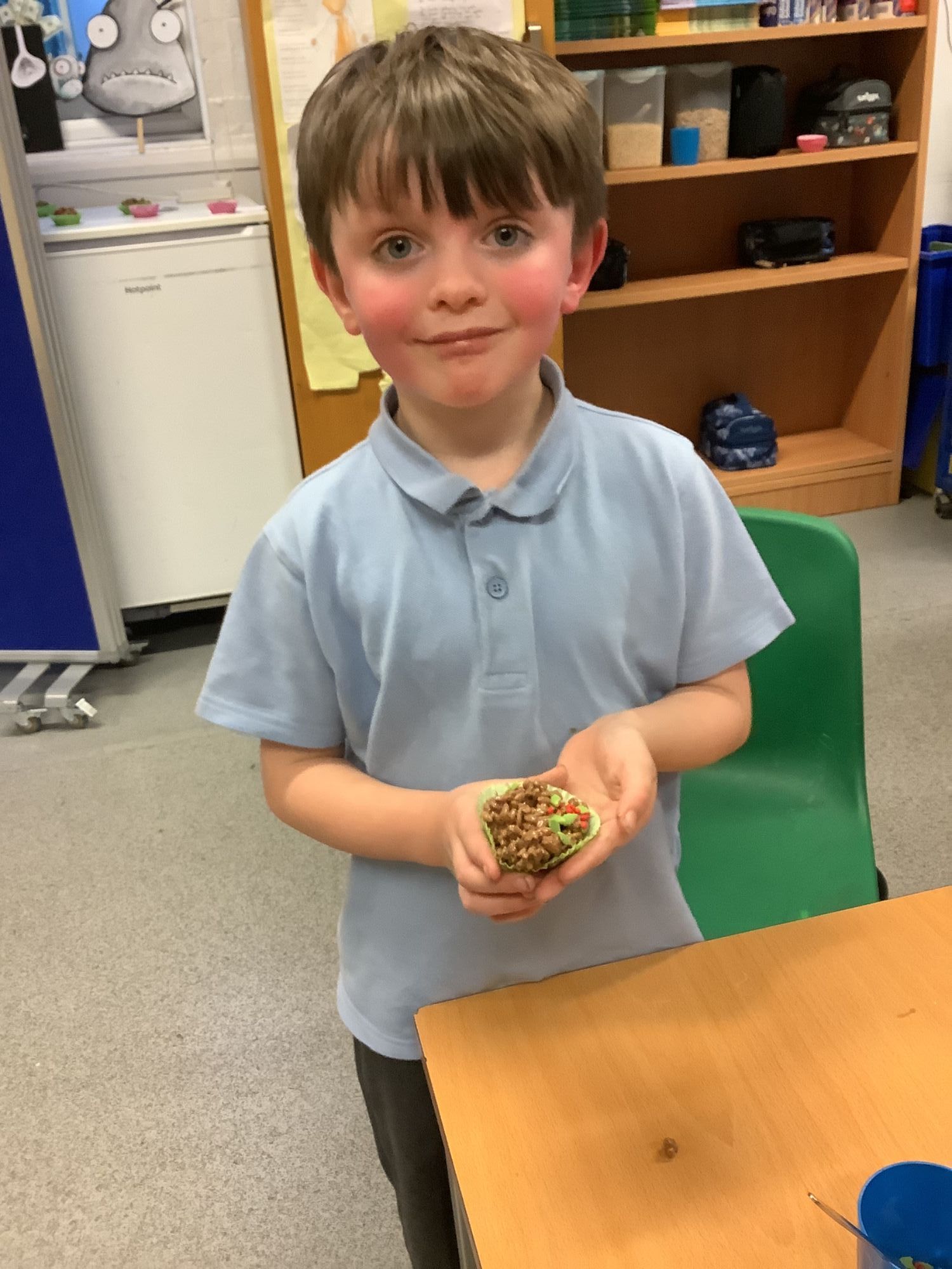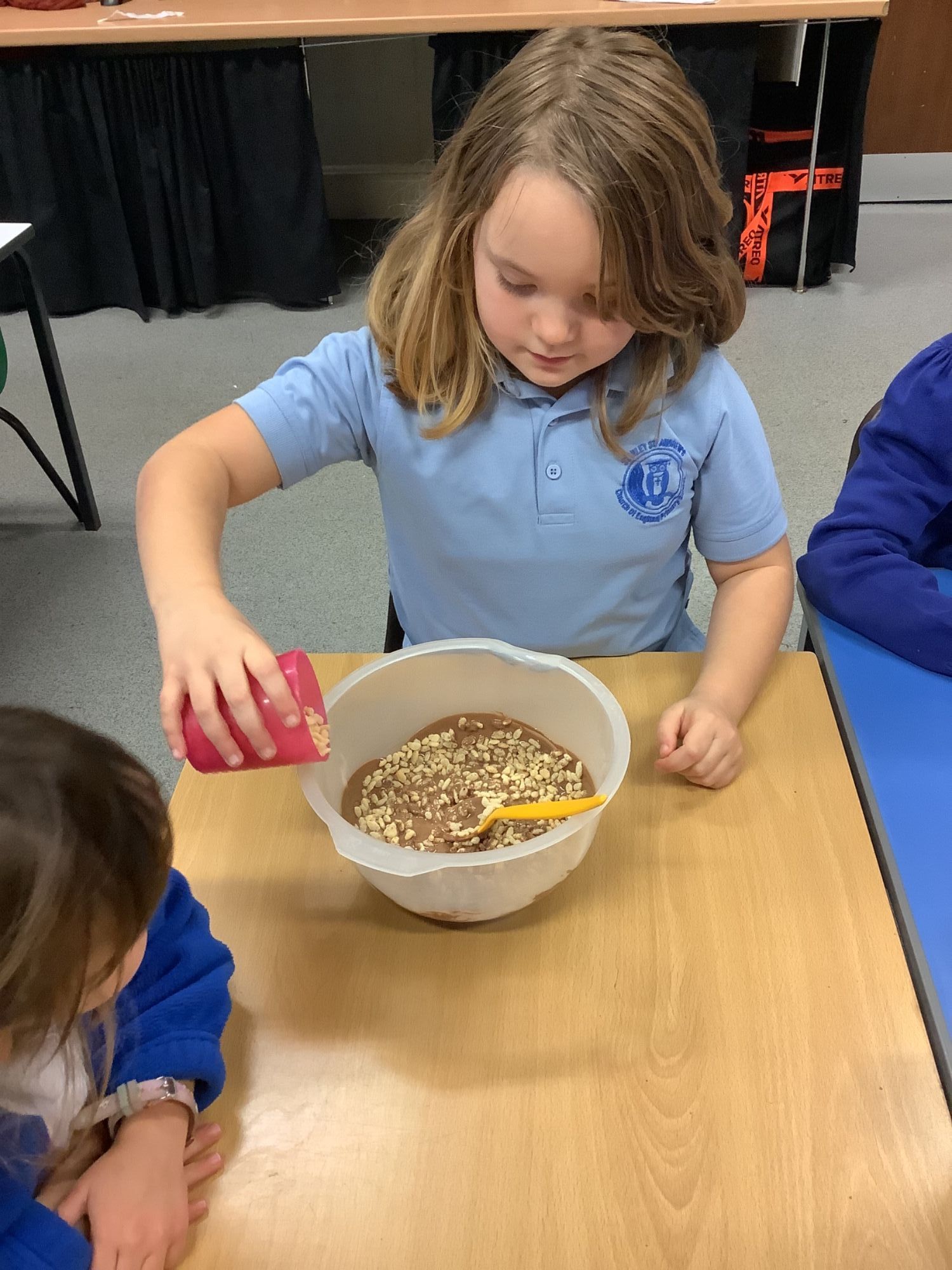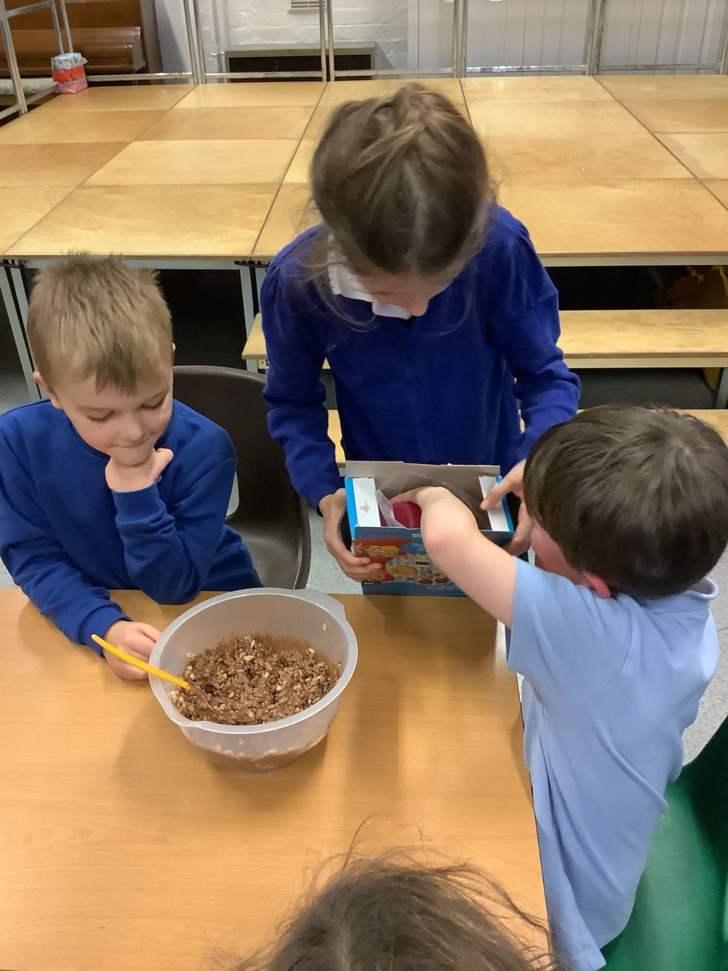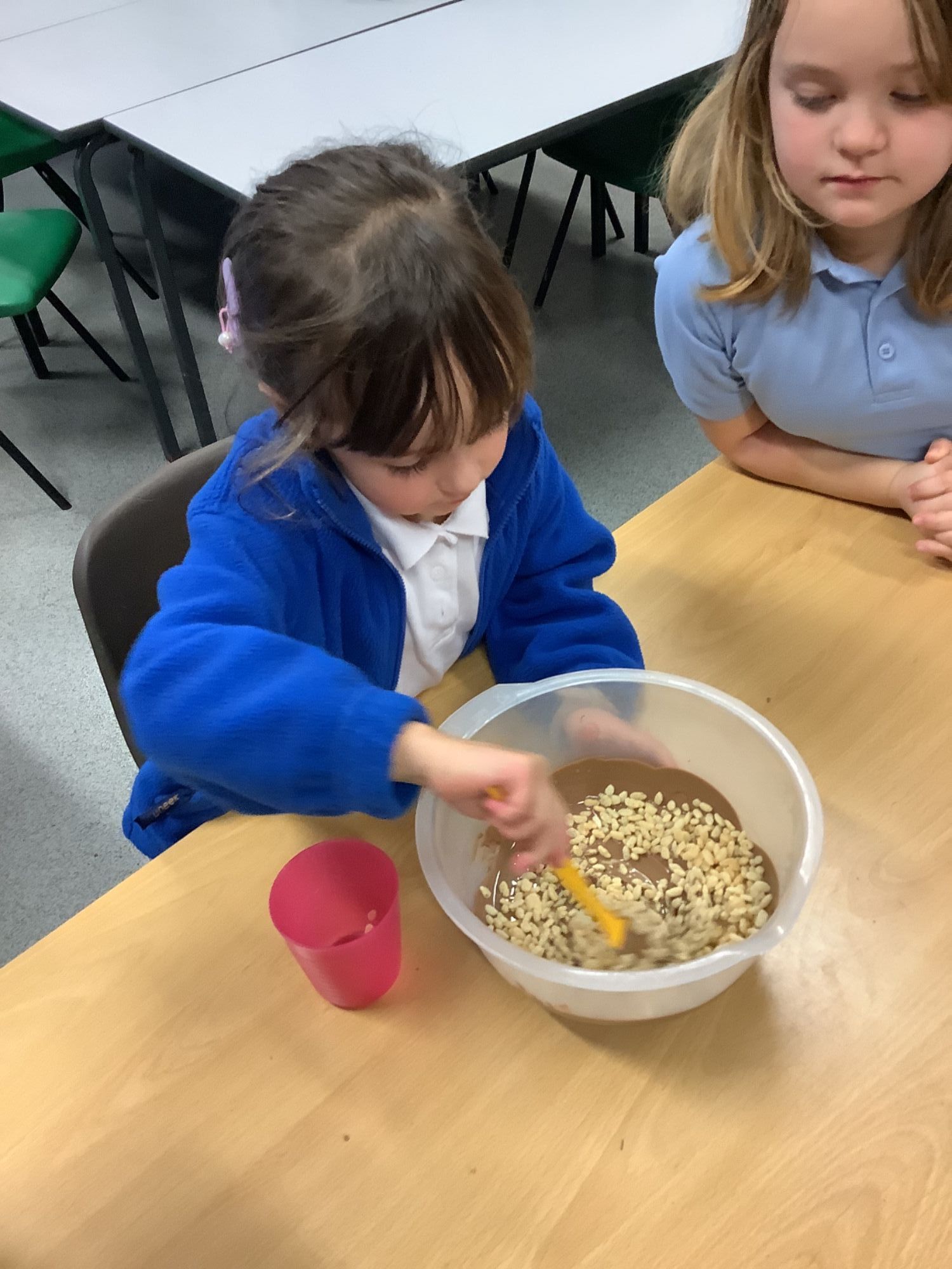 This afternoon, the children enjoyed making chocolate corn flake cakes.