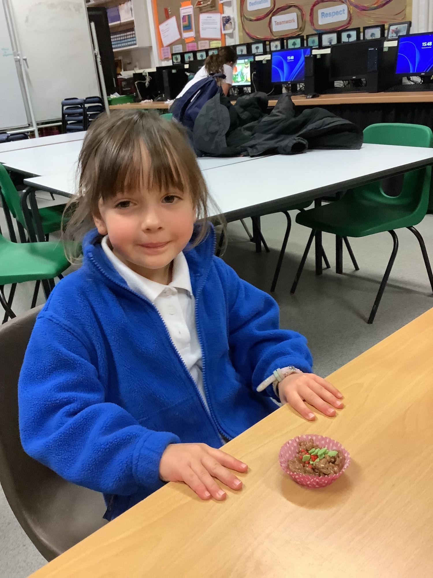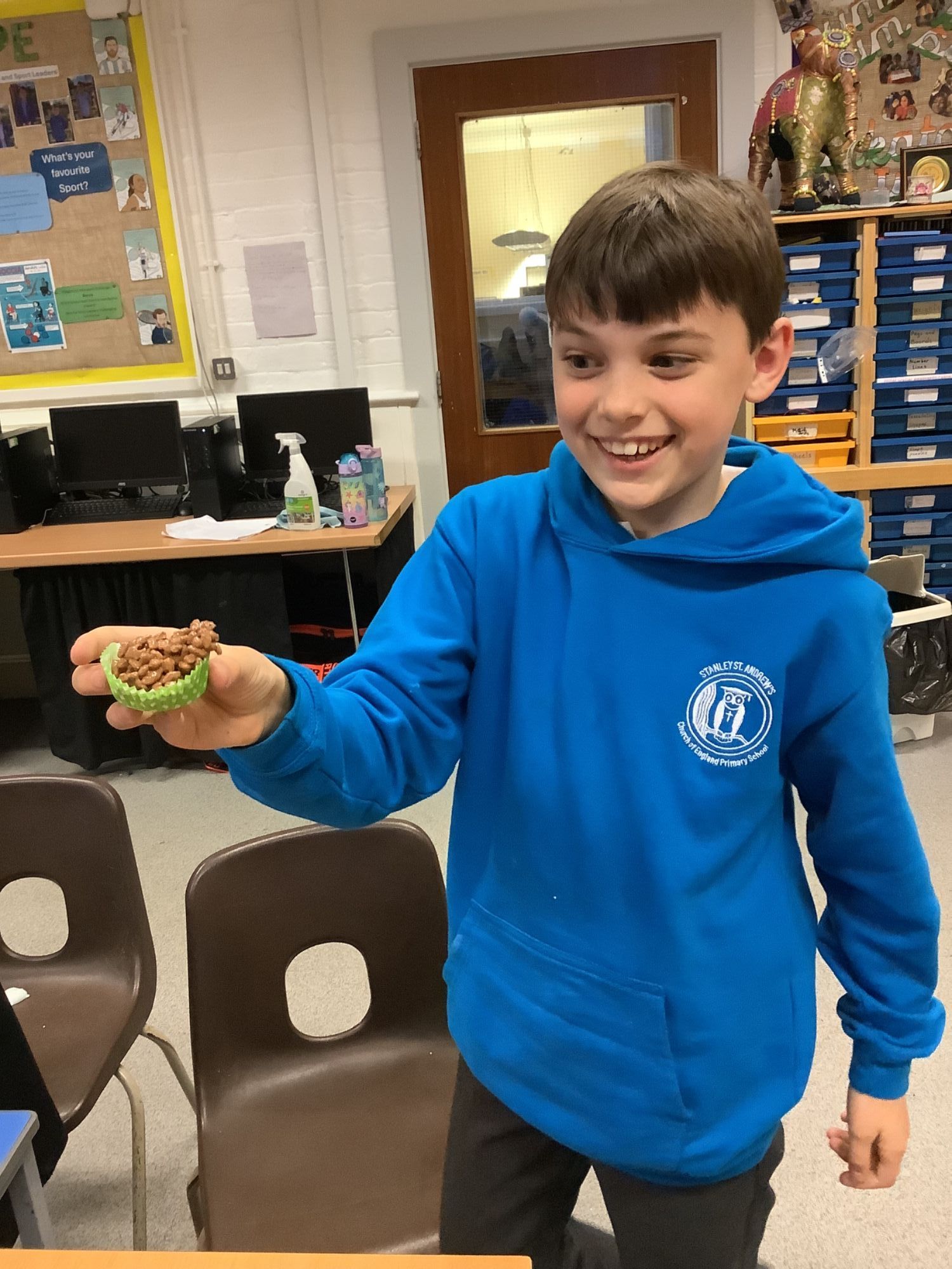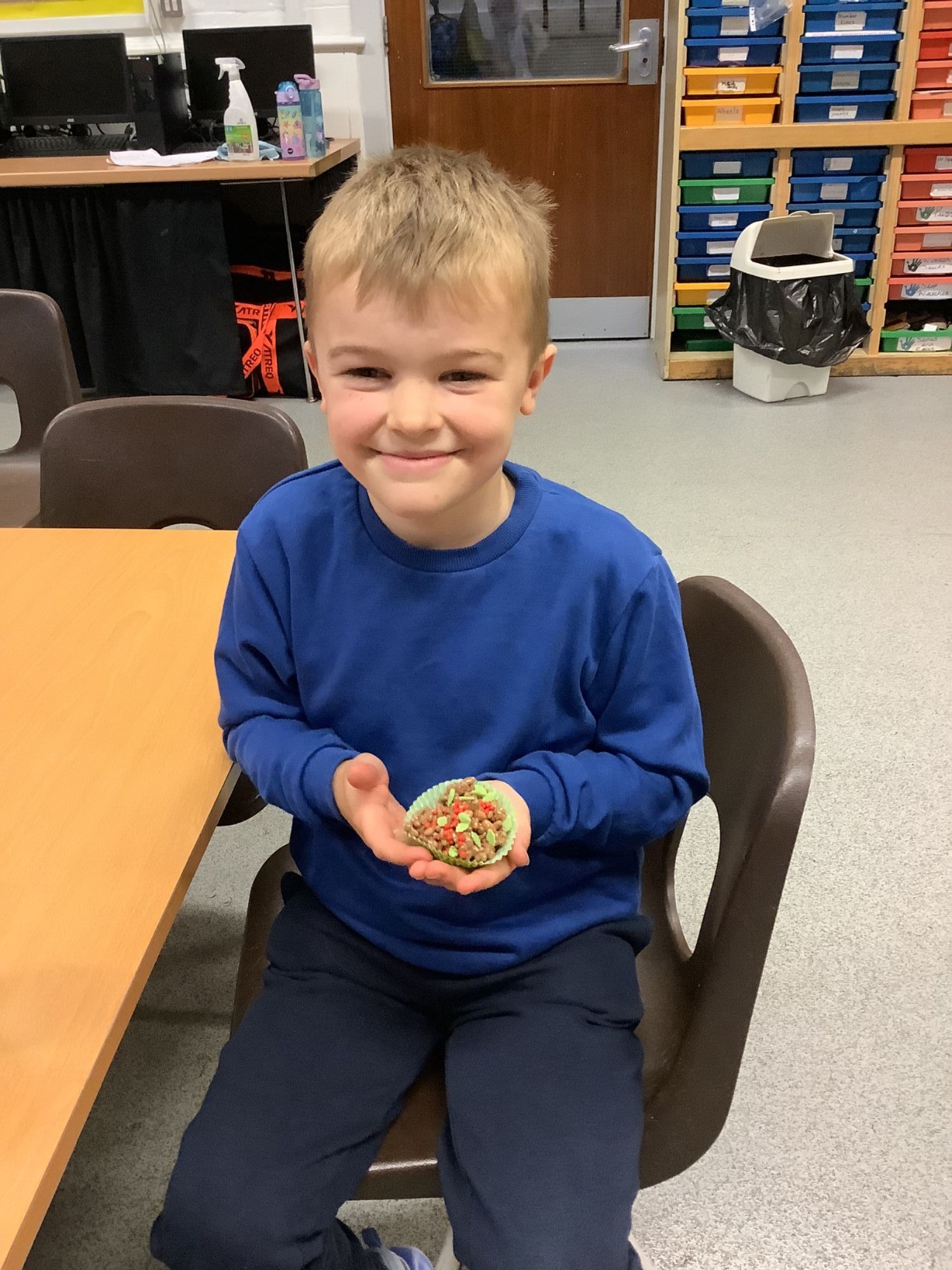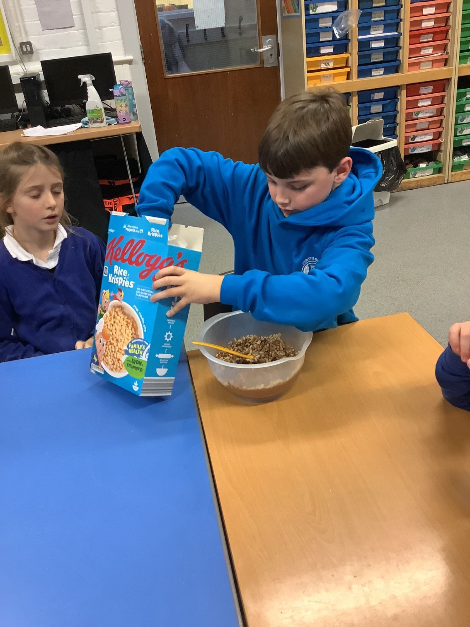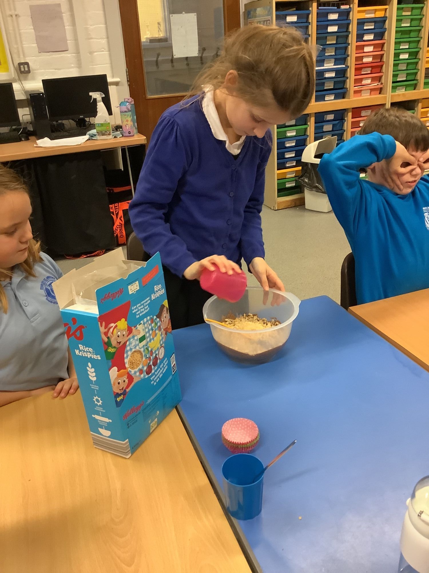 This afternoon, the children enjoyed making chocolate corn flake cakes.