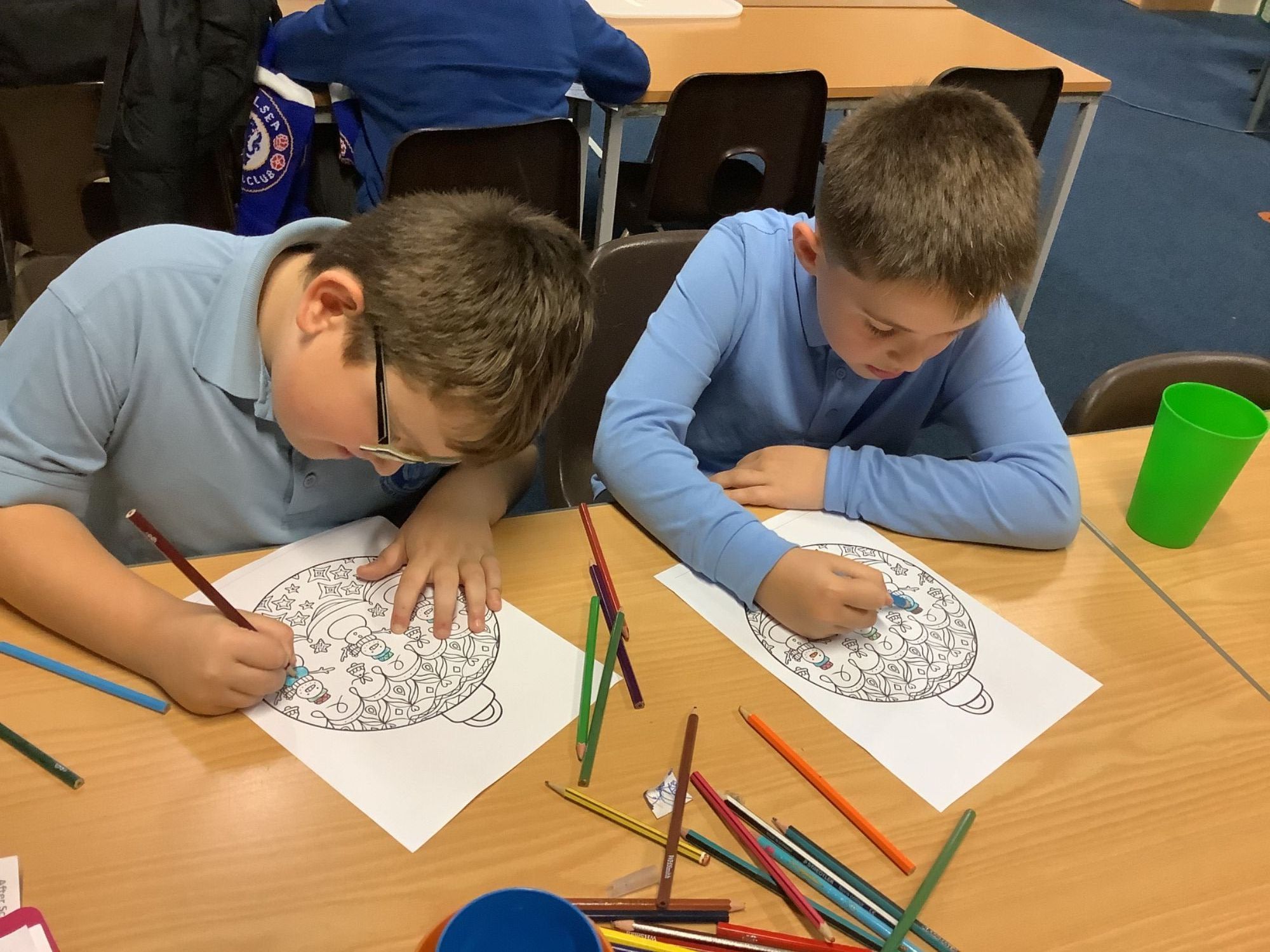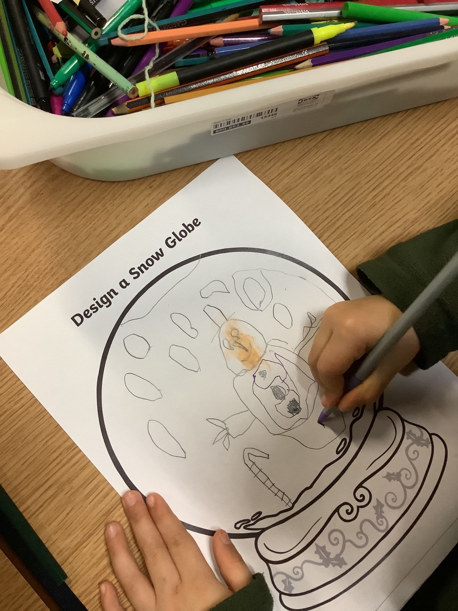 Today we have coloured and designed our own Christmas snow globes.