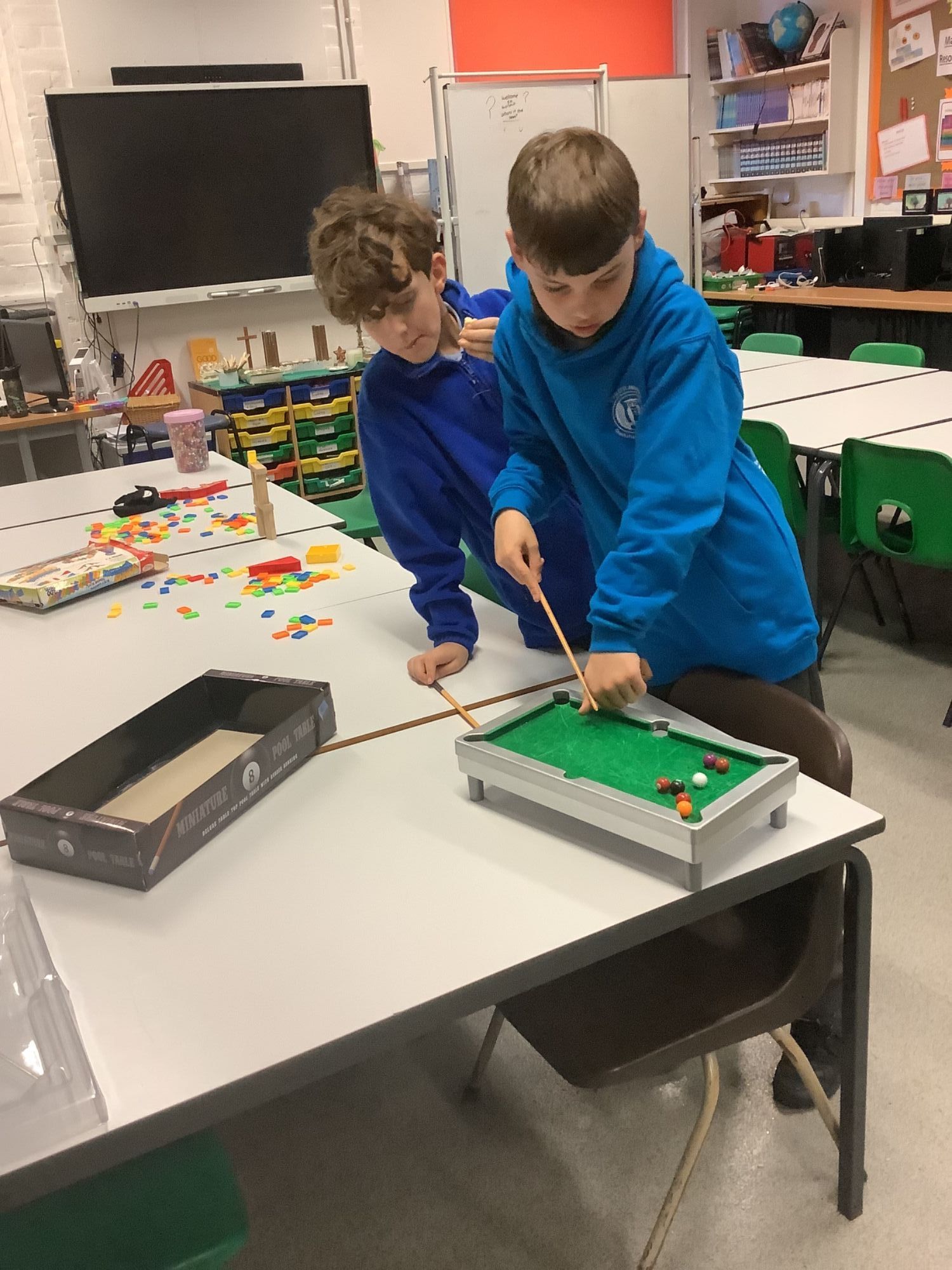 Enjoying playing the mini-pool set and using our imaginations to build with the Jenga.