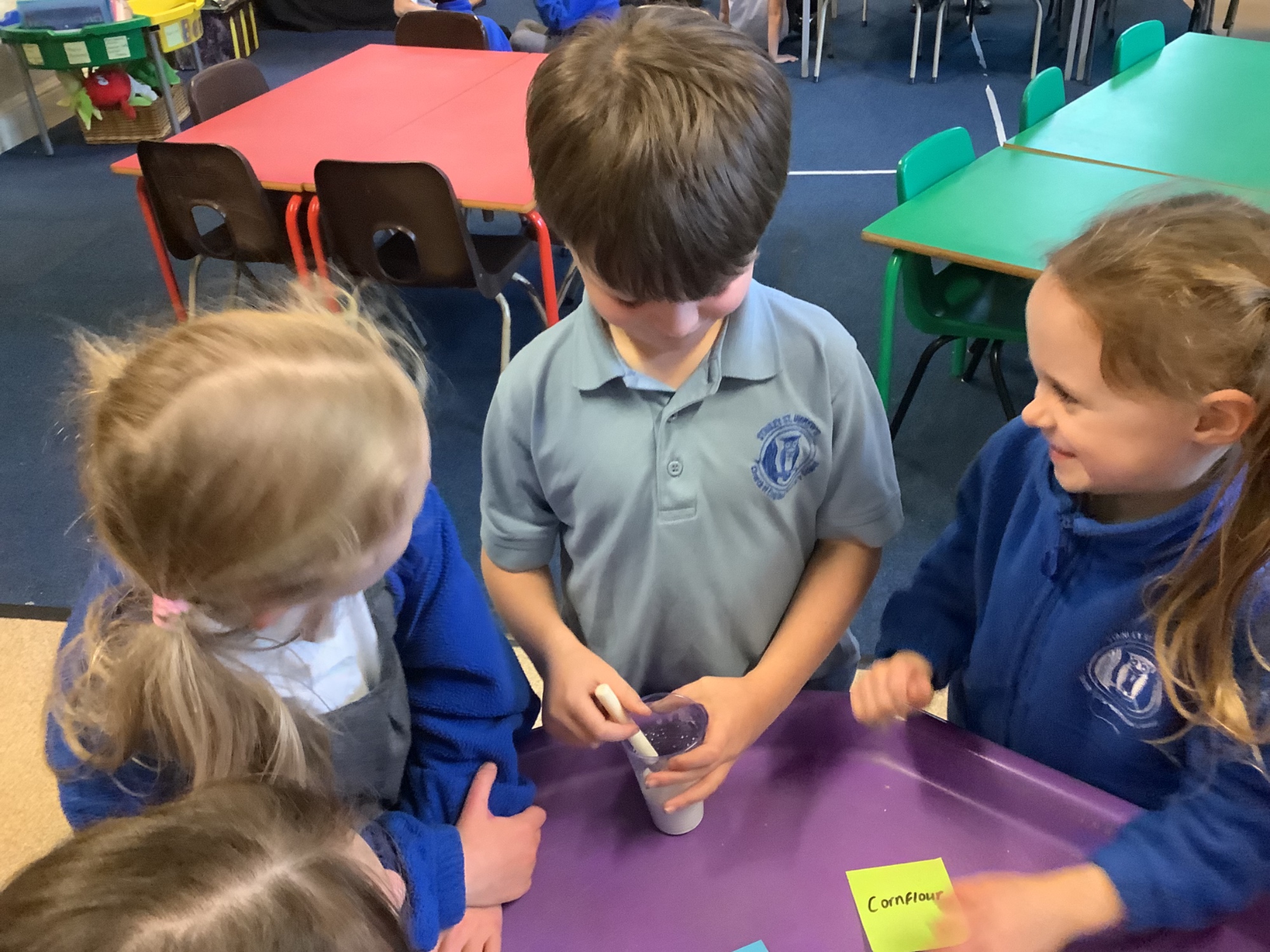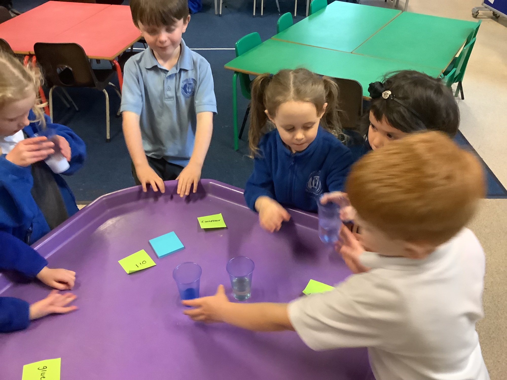 Today we have been learning about liquids and whether they can easily be stirred or not. We compared water, oil, glue, cornflour and washing up liquid.