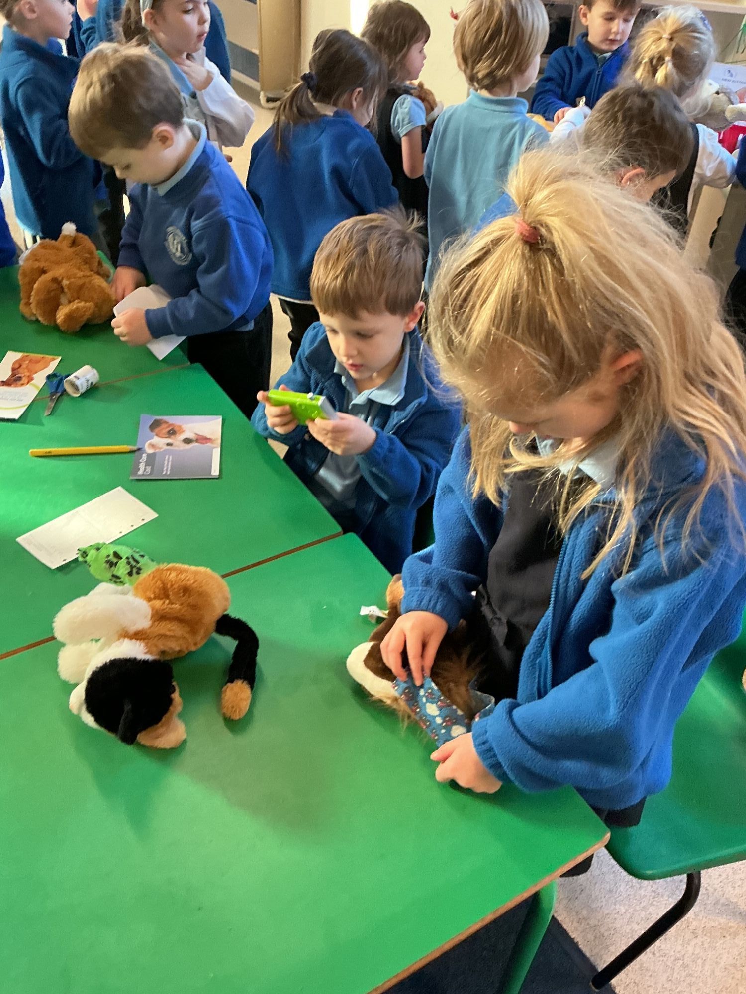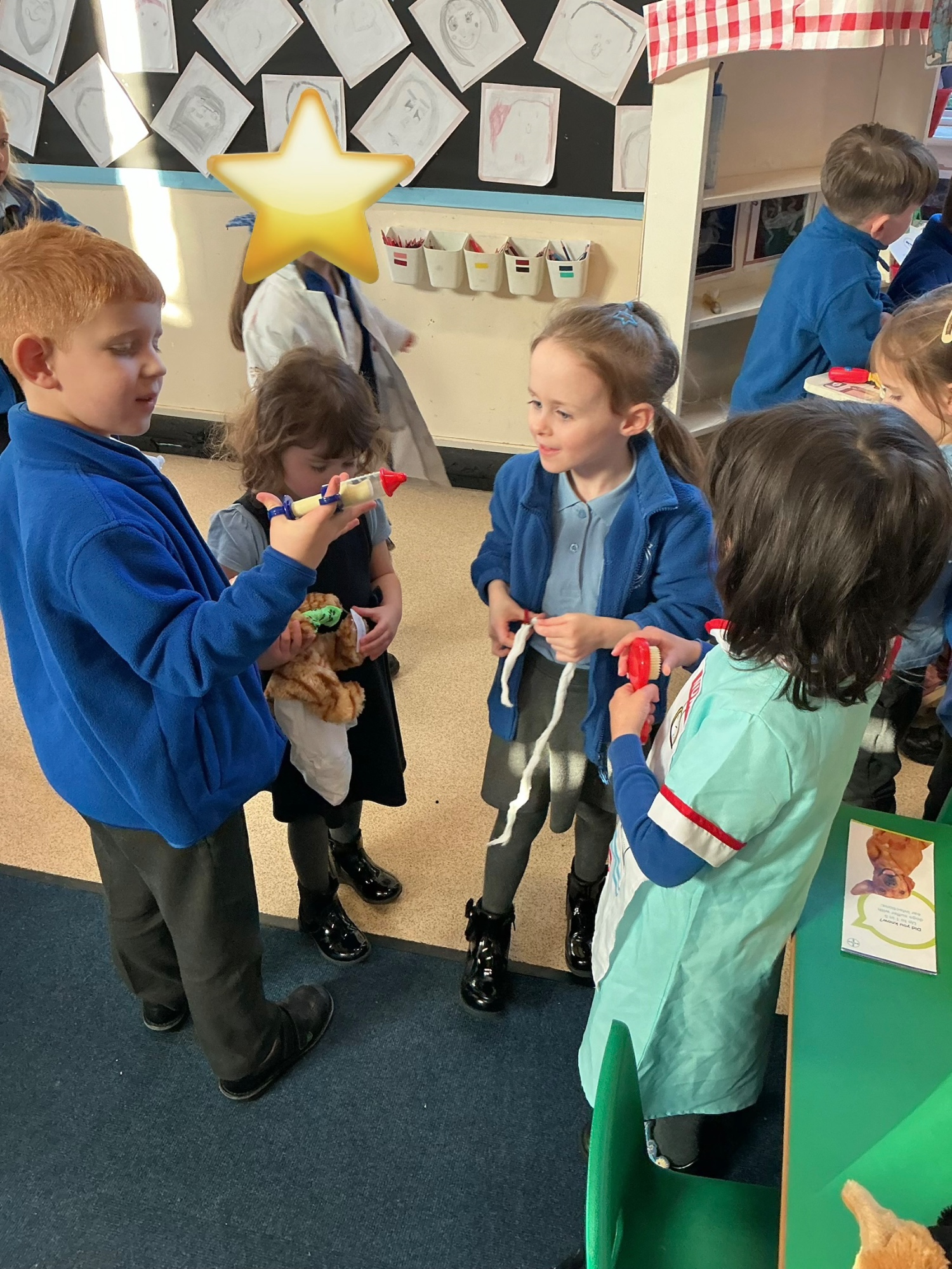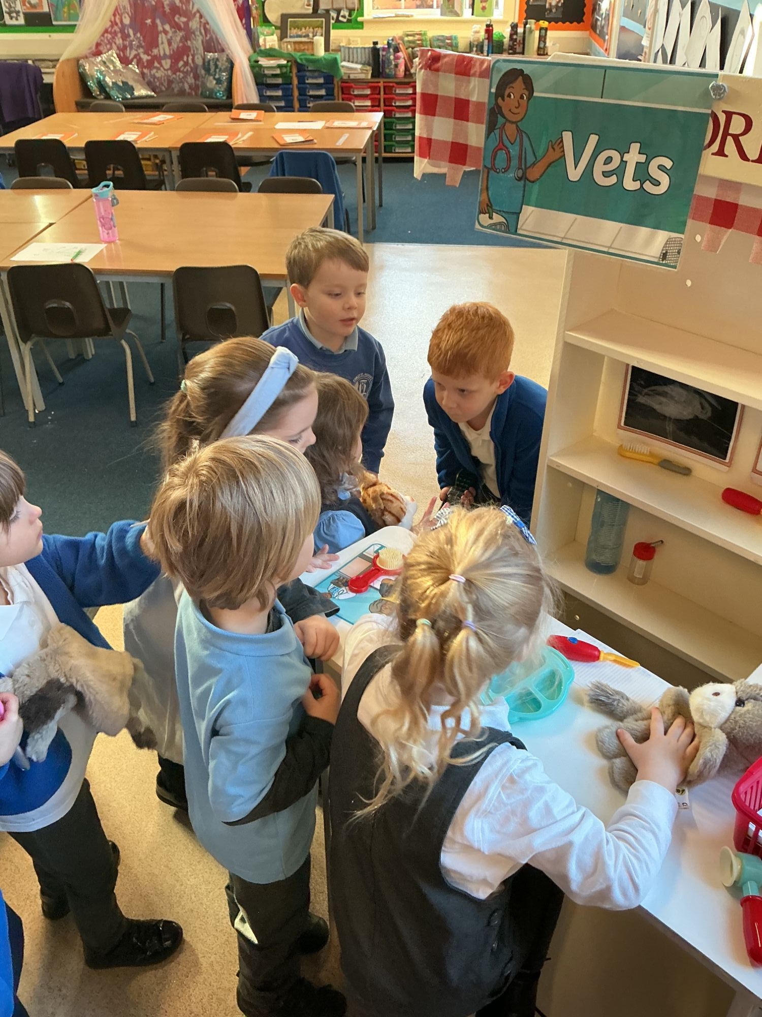 Reception and year one were playing in the vets surgery helping the animals to feel better. We talked about what a vet does.