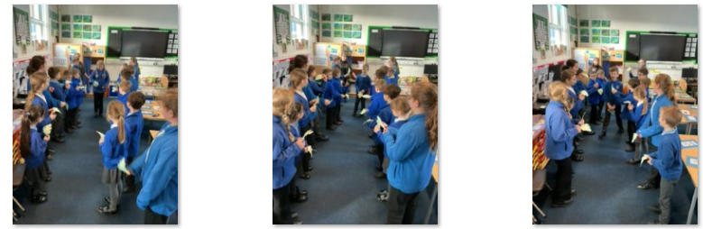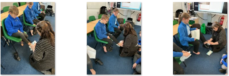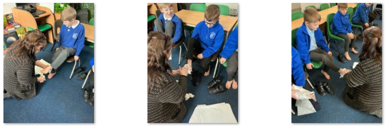 Miss Price washed the feet of a number of children. The children were asked to think about how the disciples were feeling about Jesus washing their feet and how the children felt about Miss Price washing their feet.